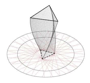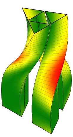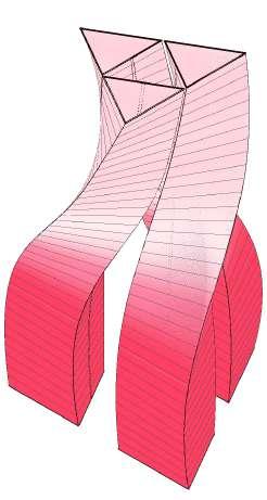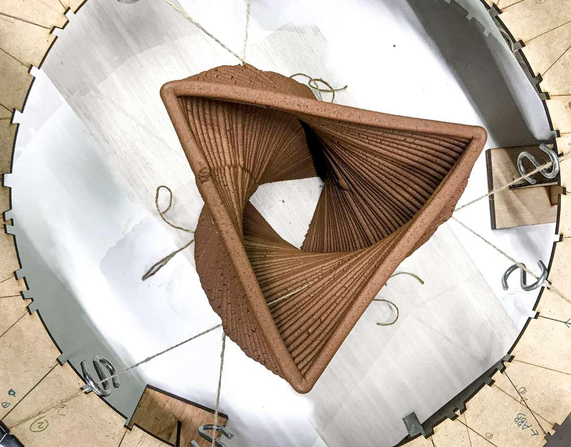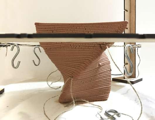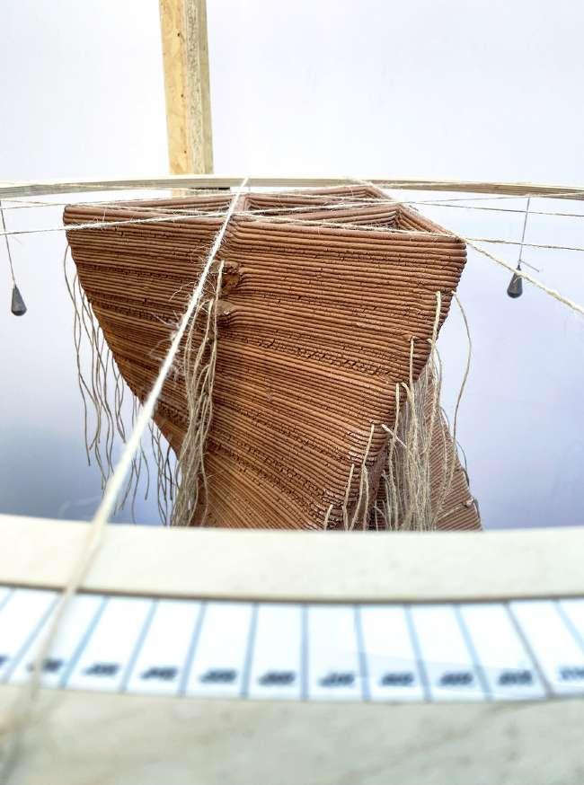 Prototype 01 is printed by ABB robotic arm. In the beginning, it shows bending on the surface when the geometry twisted a lot. After 10 layers(30mm height) are printed, Manila ropes are placed with metal clips which keep tension of ropes and these ropes hold the surface which has bending. It shows that pre-tensioned rope reduces the chance of collapse and helps more overhang achieved during printing.