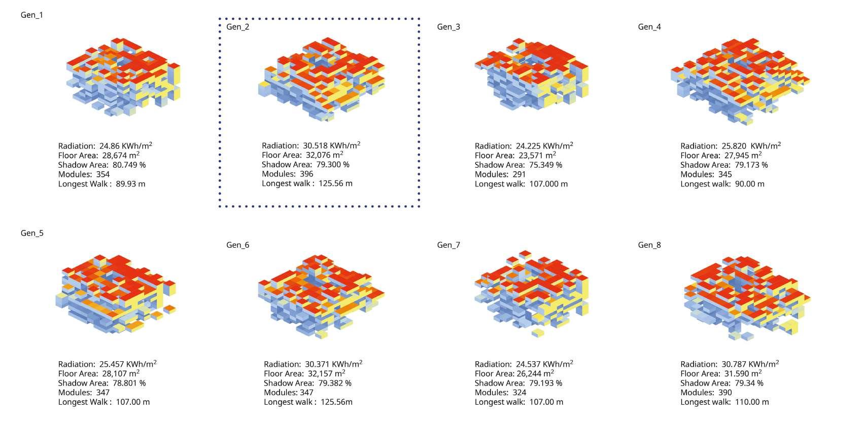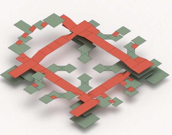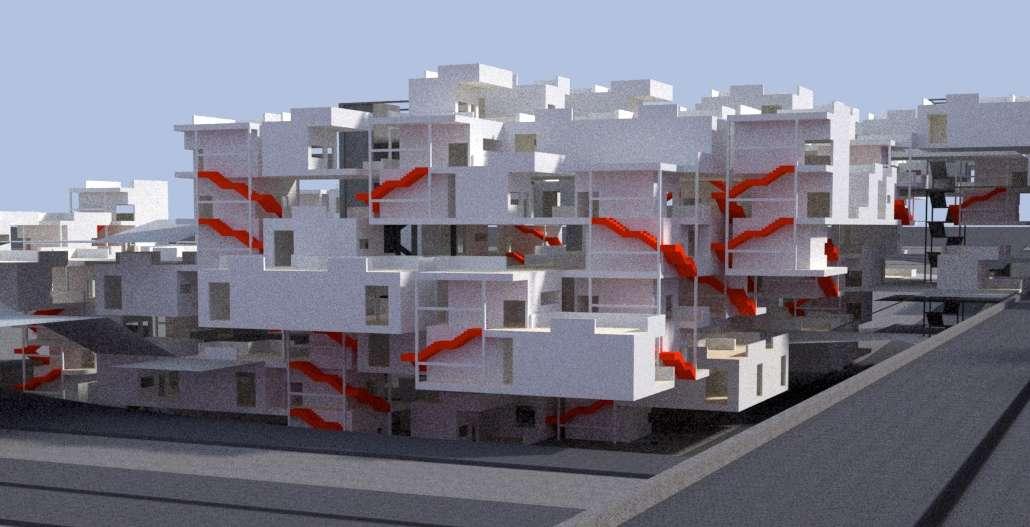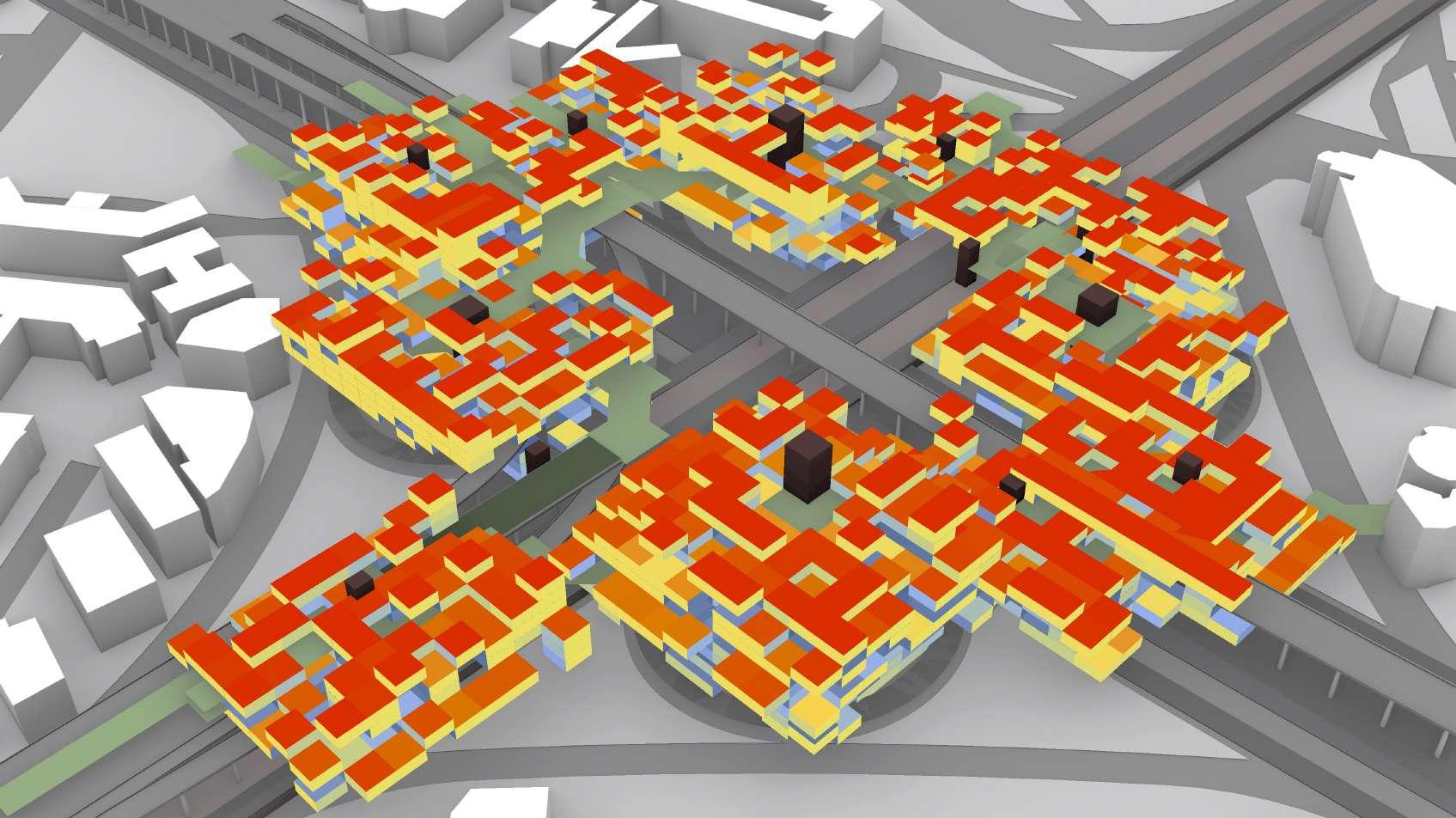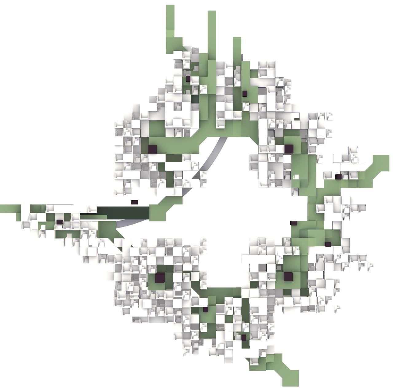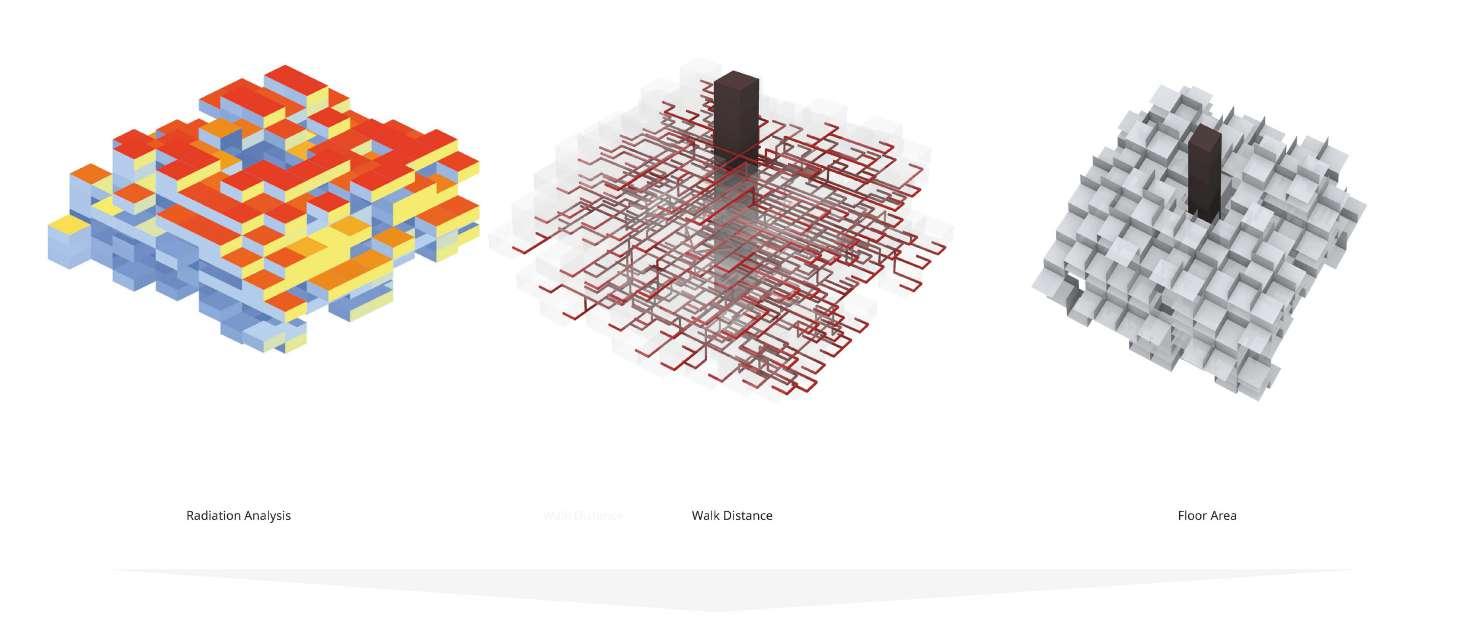 첫번째 단계에서는 9mx9mx9m의 정육면체를 고가도로의 빈공간에 배치한 후 태양광 실뮬에이션을 통해 일조량이 부족한 정육면체는 제거된 다. 이 과정은 Computational Design을 통해 실뮬레이션 되고 최적화된다. 이후 두번째 단계에서는 접근을 위한 코어, 고가도로, 새롭게 만들 어진 공간의 효율적 접근을 위해 최단거리를 찾는 실뮬레이션이 진행된다. 이렇게 실뮬레이션된 동선은 계단, 복도, 공공 공간이 된다.