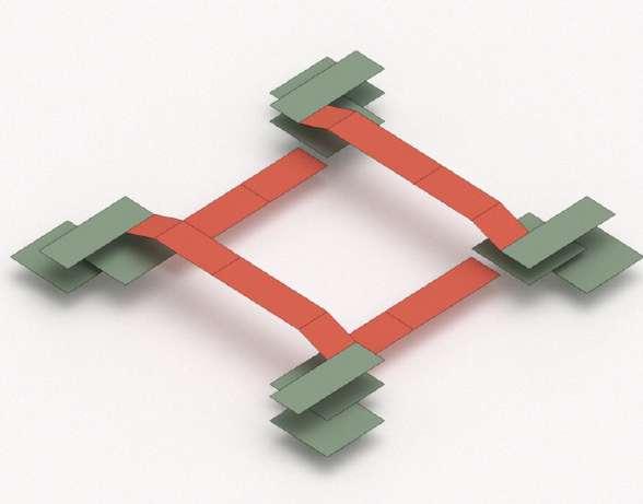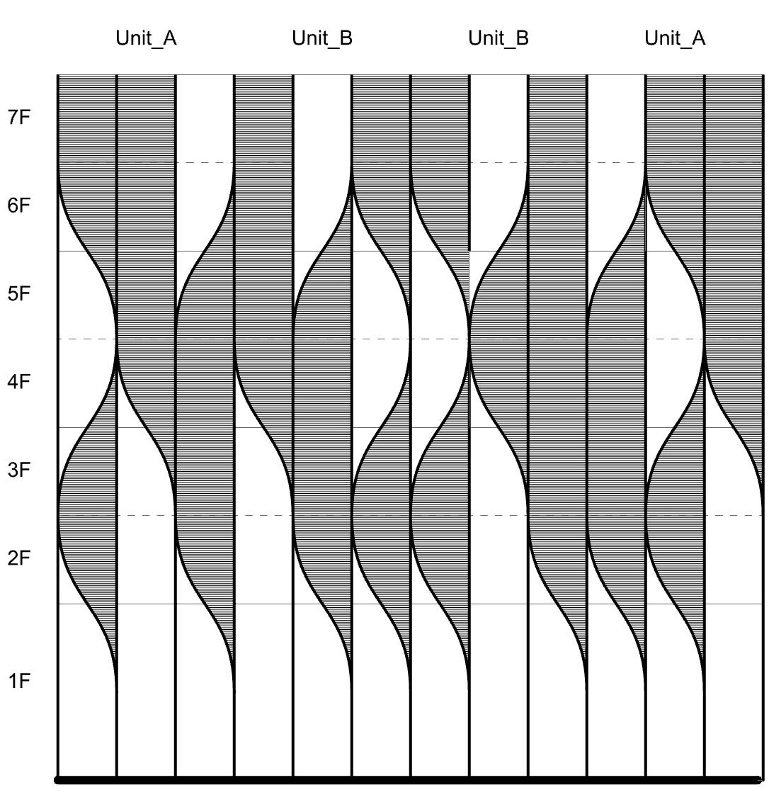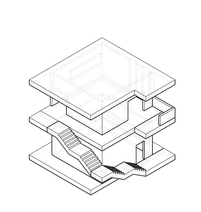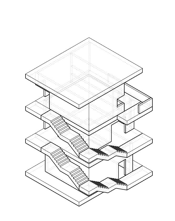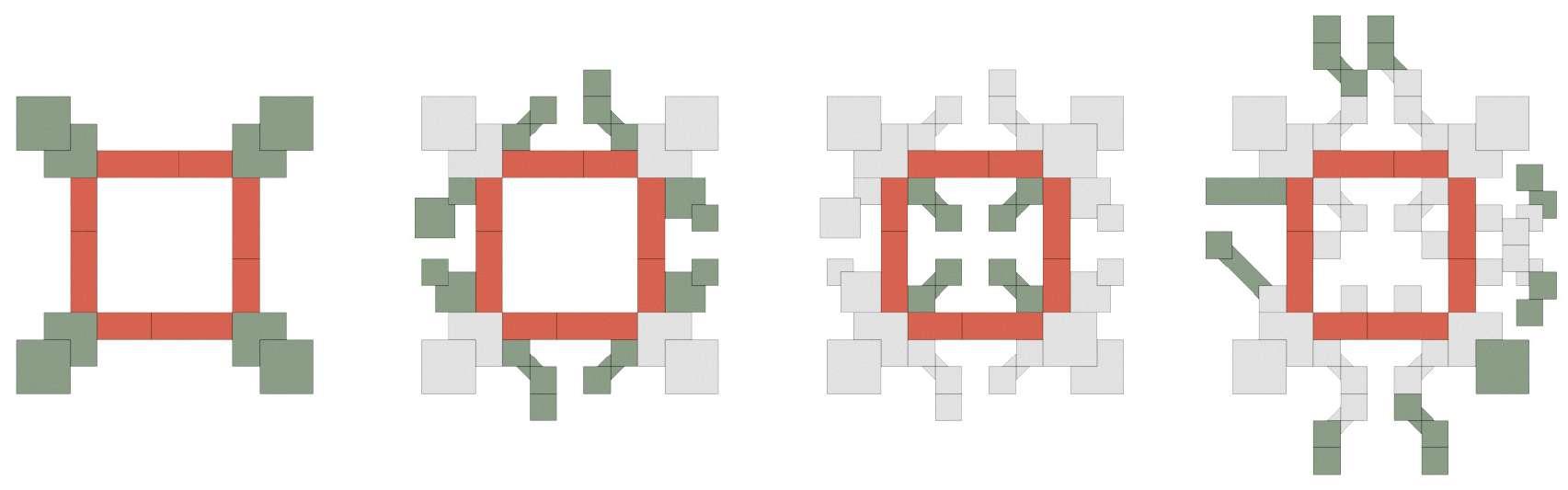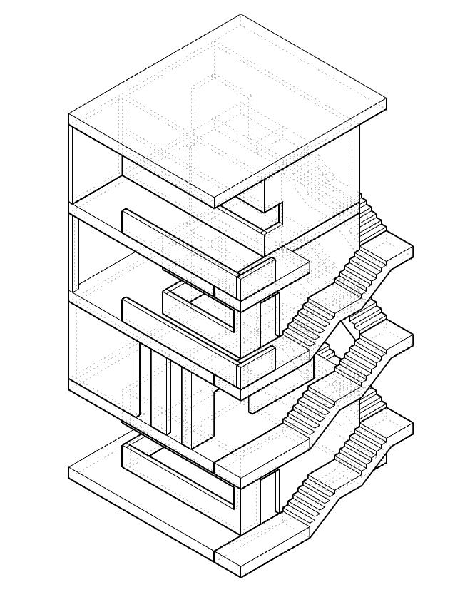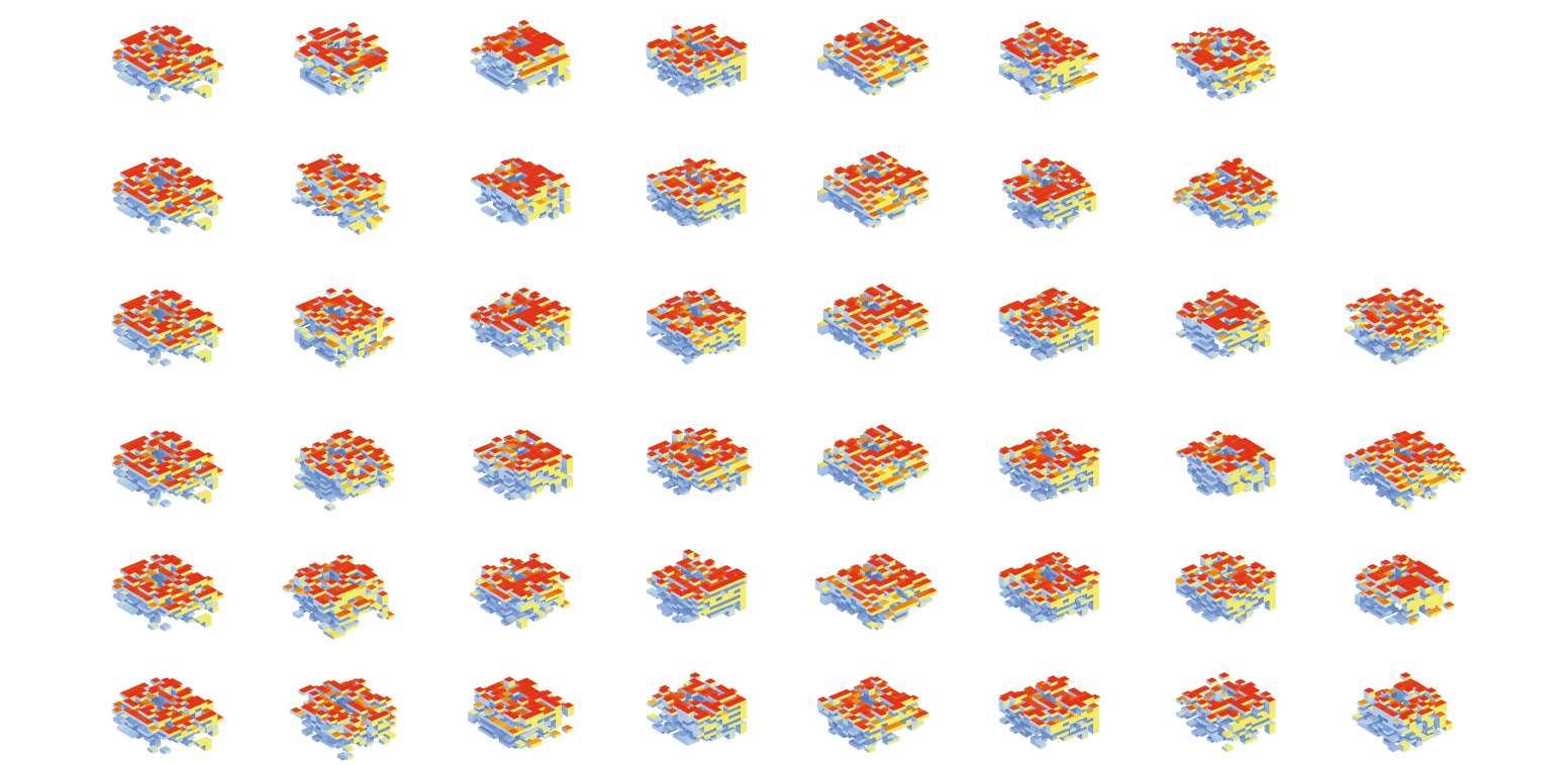 첫번째 단계에서는 9mx9mx9m의 정육면체를 고가도로의 빈공간에 배치한 후 태양광 실뮬에이션을 통해 일조량이 부족한 정육면체는 제거된 다. 이 과정은 Computational Design을 통해 실뮬레이션 되고 최적화된다. 이후 두번째 단계에서는 접근을 위한 코어, 고가도로, 새롭게 만들 어진 공간의 효율적 접근을 위해 최단거리를 찾는 실뮬레이션이 진행된다. 이렇게 실뮬레이션된 동선은 계단, 복도, 공공 공간이 된다.