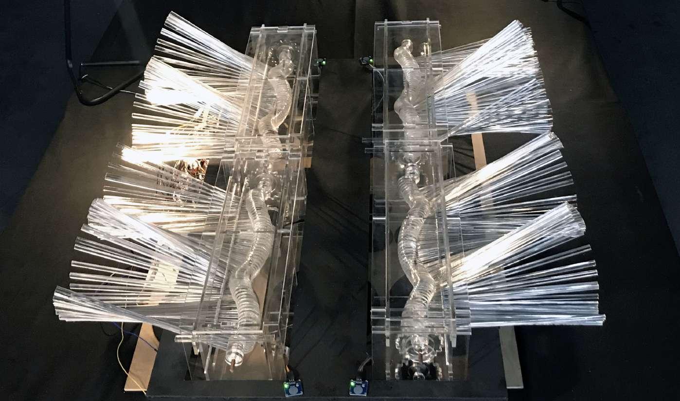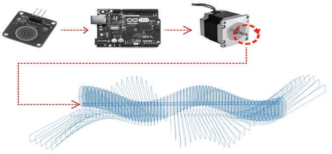 4 touching sensors are used for stimulus. When one touching sensor detects touching, the step motor which is connected to this sensor actuates. After the step motor rotates one cycle the next step motor will start to work. Like this ,the motors will work consecutively. This successive movement will be an imitation of the living system. The connection between the touch sensor and step motor is made by Arduino board and coding. The code can be modified to change the order of initiating the motor, the speed or direction. There are a lot of possibilities to make different response systems to creating different code.