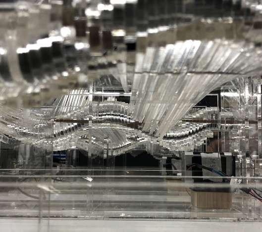 The step motors movement is too simple to represent the living shape. So a conversion system is needed. Simple rotation is converted to wave movement by using twisted cylinder axis. When the cylinder rotates twisted surfaces push each stick at a different timing. This different timing makes wave movement.