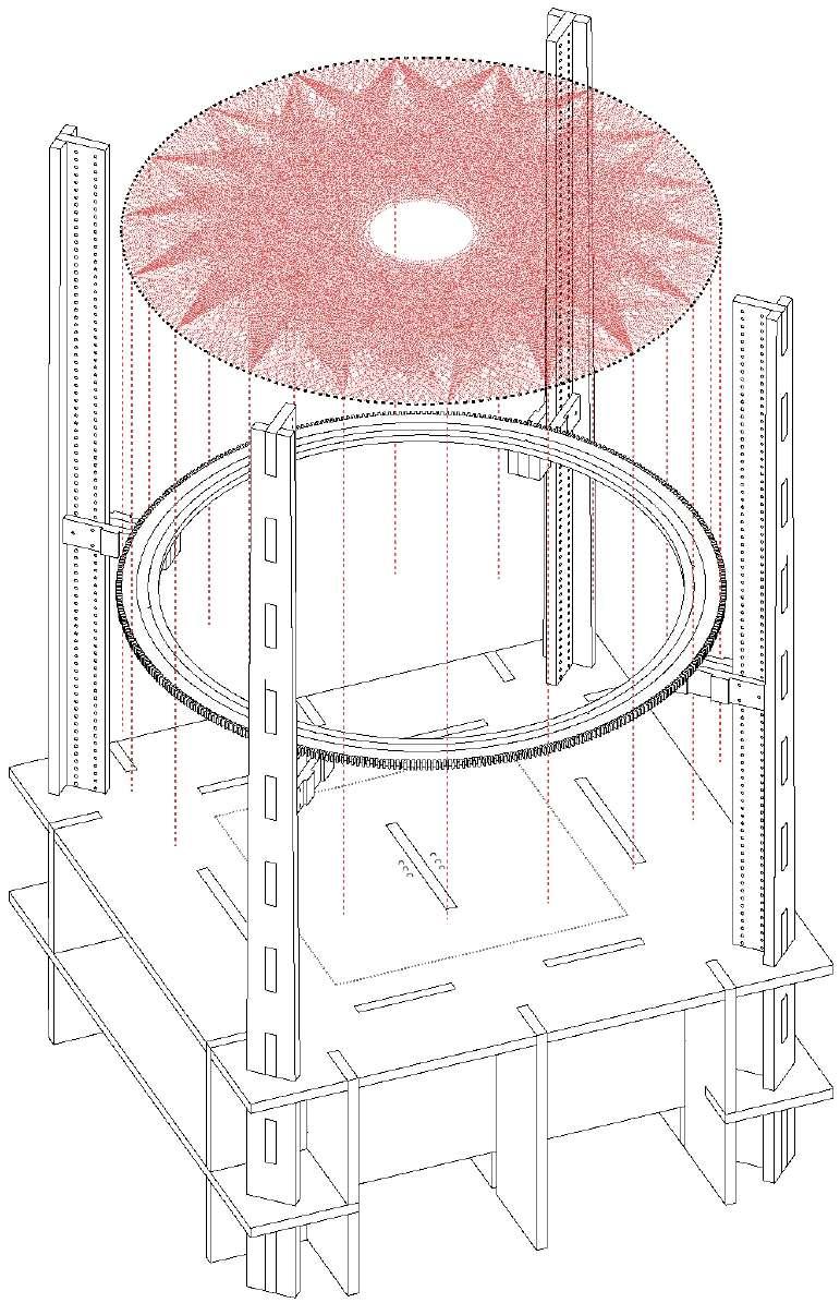 The universal wheel can hold about 1000 ropes with different angles. It means that this wheel can work for reinforcement on any ruled surface. The frame is for holding the wheel on the top of printed layers. This frame has 82 stpes for height variation(1 step is 1.75cm distance). The maximum printing area is 1 m diameter and 1.5 meter height.