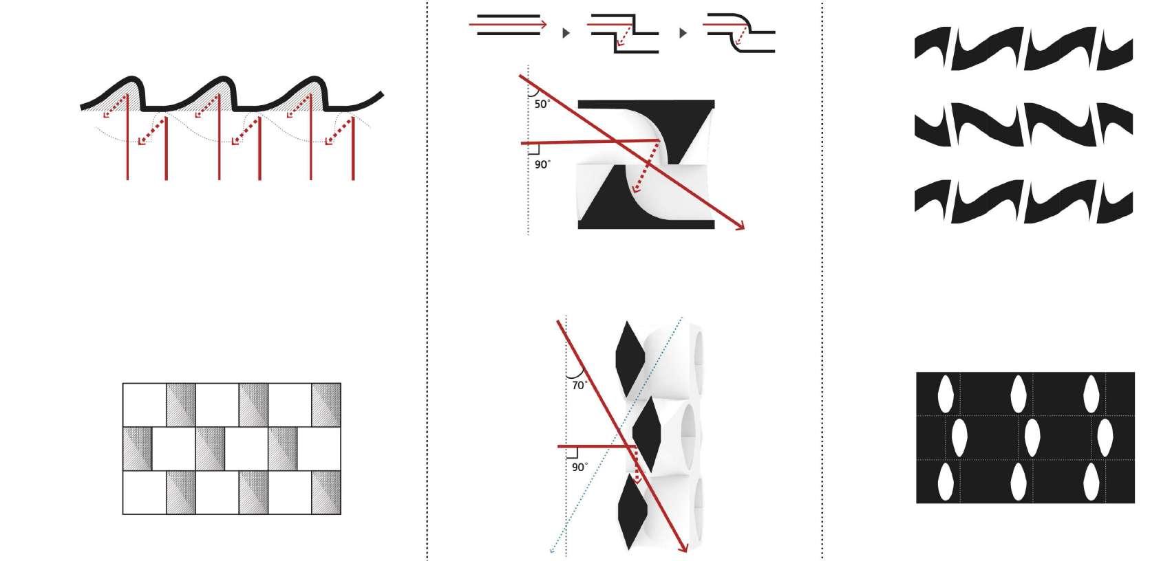 For light filtration, these bricks have curved openings. These openings block direct light. This blocked light reflects on the concave surface and becomes an indirect light. Other openings are formed by assembling 6 bricks. So depending on brinks orientation, the direction of the curved surface would be changed. It can be a possibility of variation.
