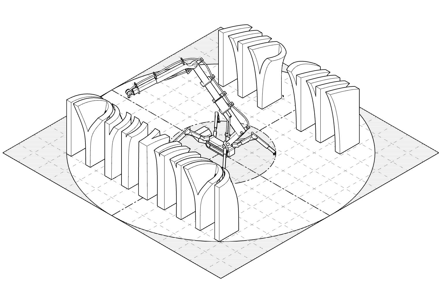 Prototype 02 is printed by large scale robotic arm(Kuka). This printing is a test of the universal wheel and rope reinforcement system. The problem is that placed ropes move while printing top of them. It is because rope are placed on the same height with printed layer so there is no tension to vertical direction. So rope can slip very easily. This problem is sovled by setting the wheel height little bit lower than printed layer. After that, when placing ropes, ropes and lead weights push down the layer little bit so ropes are fixed to layer while printing next layer.