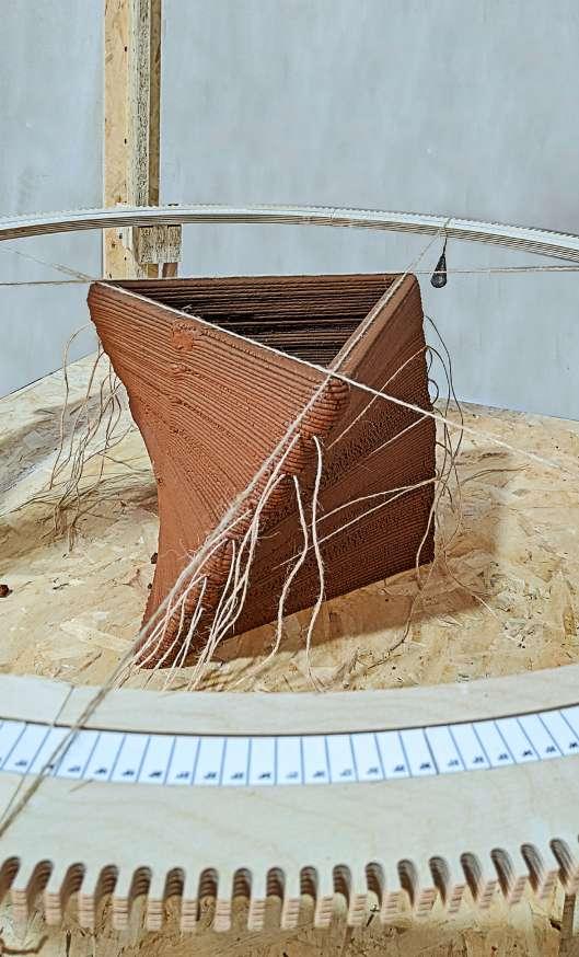 The traditional earth architectures have many reinforcement ways such as mixing short fibers with earth, using wooden frames and so on.The mixing fiber with earth is the most common way to improve material strength.. The wooden frame with an earth wall is also a great way for reinforcing earth architecture. These methods are for reinforcing to tensile force because the earth wall is weak to horizontal forces. However, for 3d printing architecture, we need to find different ways for reinforcement because of different construction processes with traditional earth architecture. So this research is focused on how 3d earth printing can be reinforced for constructing.