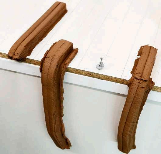 All samples' length are 40 cm. Sample 01 is printed without reinforcement. Sample 02 is printed half of the sample height and a tensioned rope(Manila rope) is placed on the printing. This rope keeps tention by fixing to screws on the board. Sample 03 also has rope but it does not have tention at all. Result shows that smaple 01 without reinforcement is broken after moving 11.5 cm. Sample 02 is not broken at all even it moved 32 cm. Sample 03 has a little crack after moving 27 cm. So tentioned rope is the best way to reinforce the printing in a wet condition.