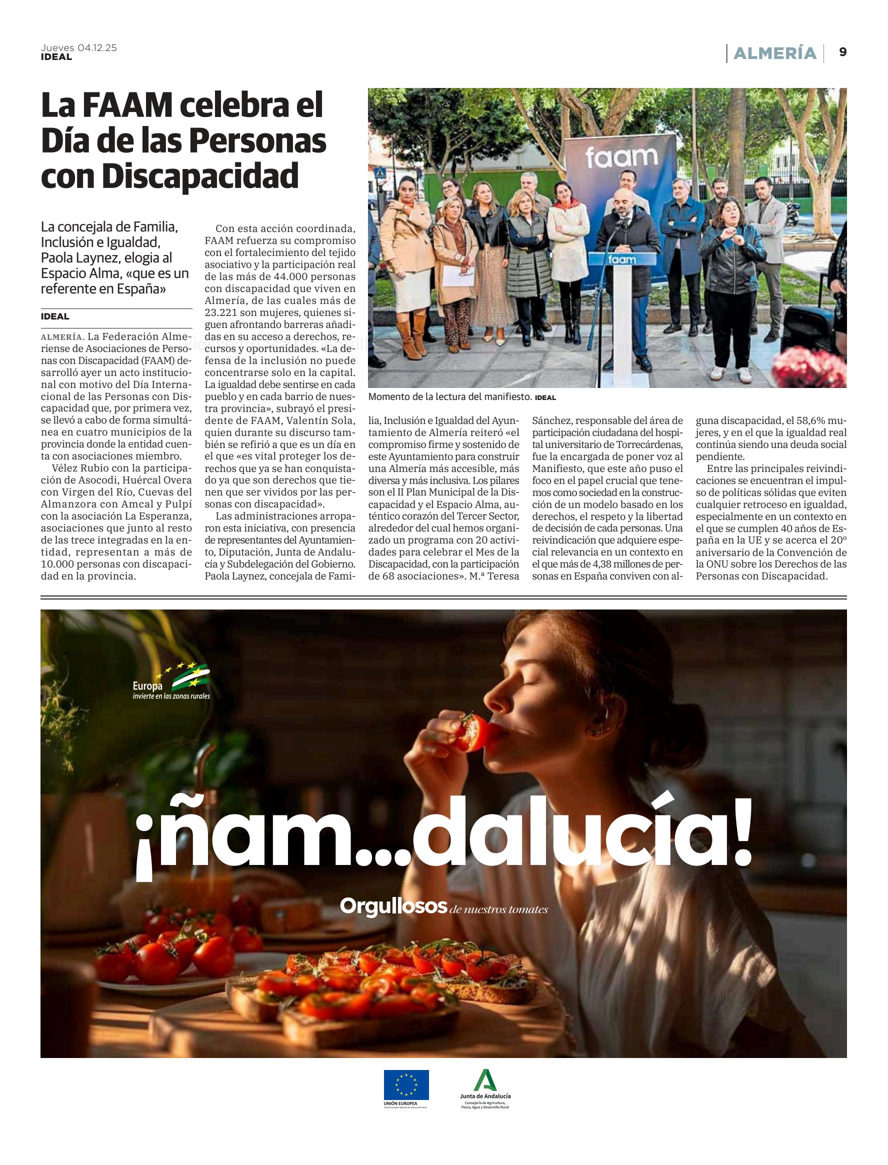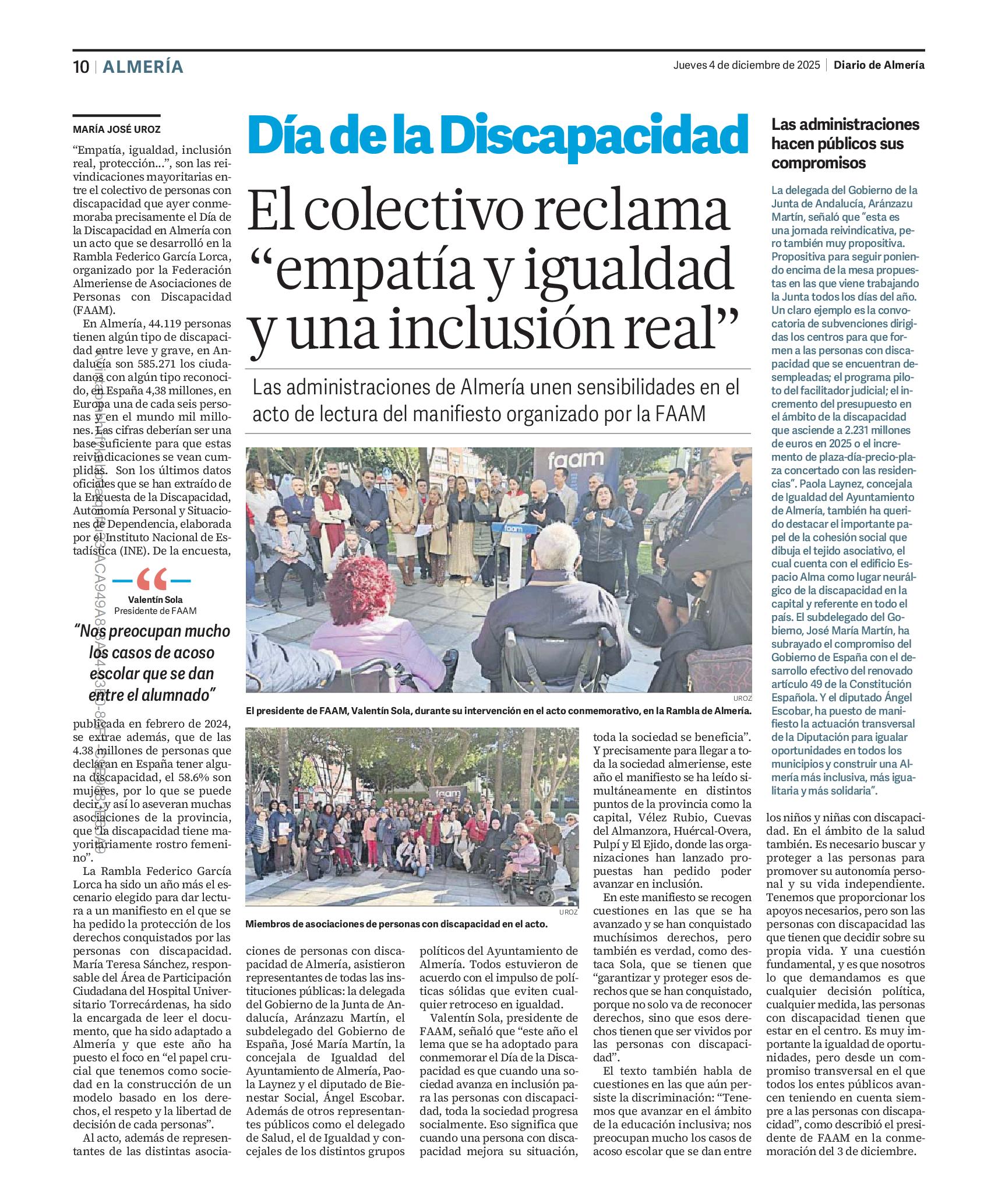 de concentrarse solo en la capital. La igualdad debe sentirse en cada pueblo y en cada barrio de nuestra provincia”, subrayó el presidente de FAAM, Valentín Sola, quien durante su discurso también se refirió a que es un día en el que “es vital proteger los derechos que ya se han conquistado ya que son derechos que tienen que ser vividos por las personas con discapacidad”. Las administraciones arroparon esta iniciativa, con presencia de representantes del Ayuntamiento, Diputación, Junta de Andalucía y Subdelegación del Gobierno. Paola Laynez, concejala de Familia, Inclusión e Igualdad del Ayuntamiento de Almería, afirmó que “hoy, Día Internacional de las Personas con Discapacidad, quiero reiterar el compromiso firme y sostenido de este Ayuntamiento para construir una Almería más accesible, más diversa y más inclusiva”.