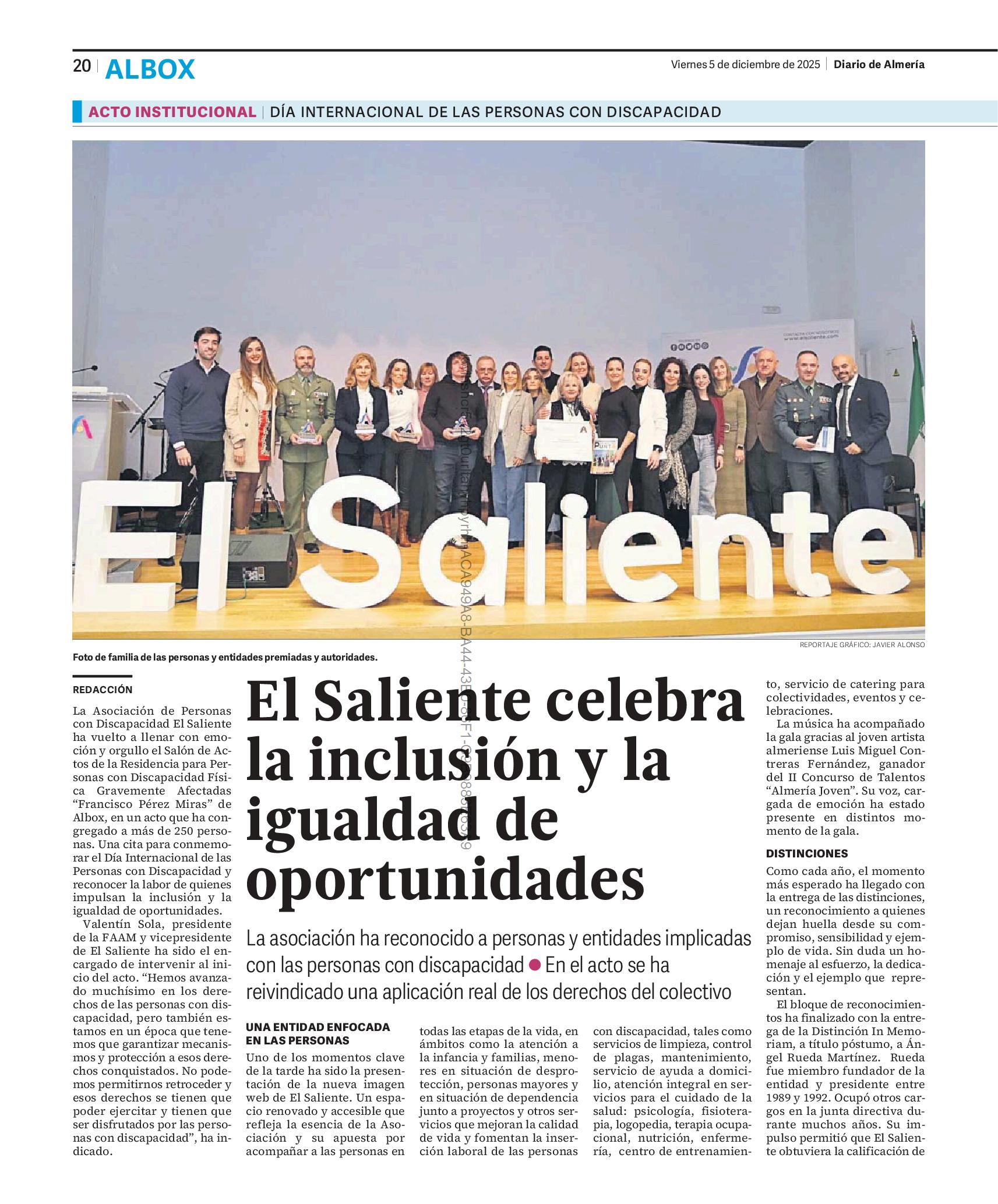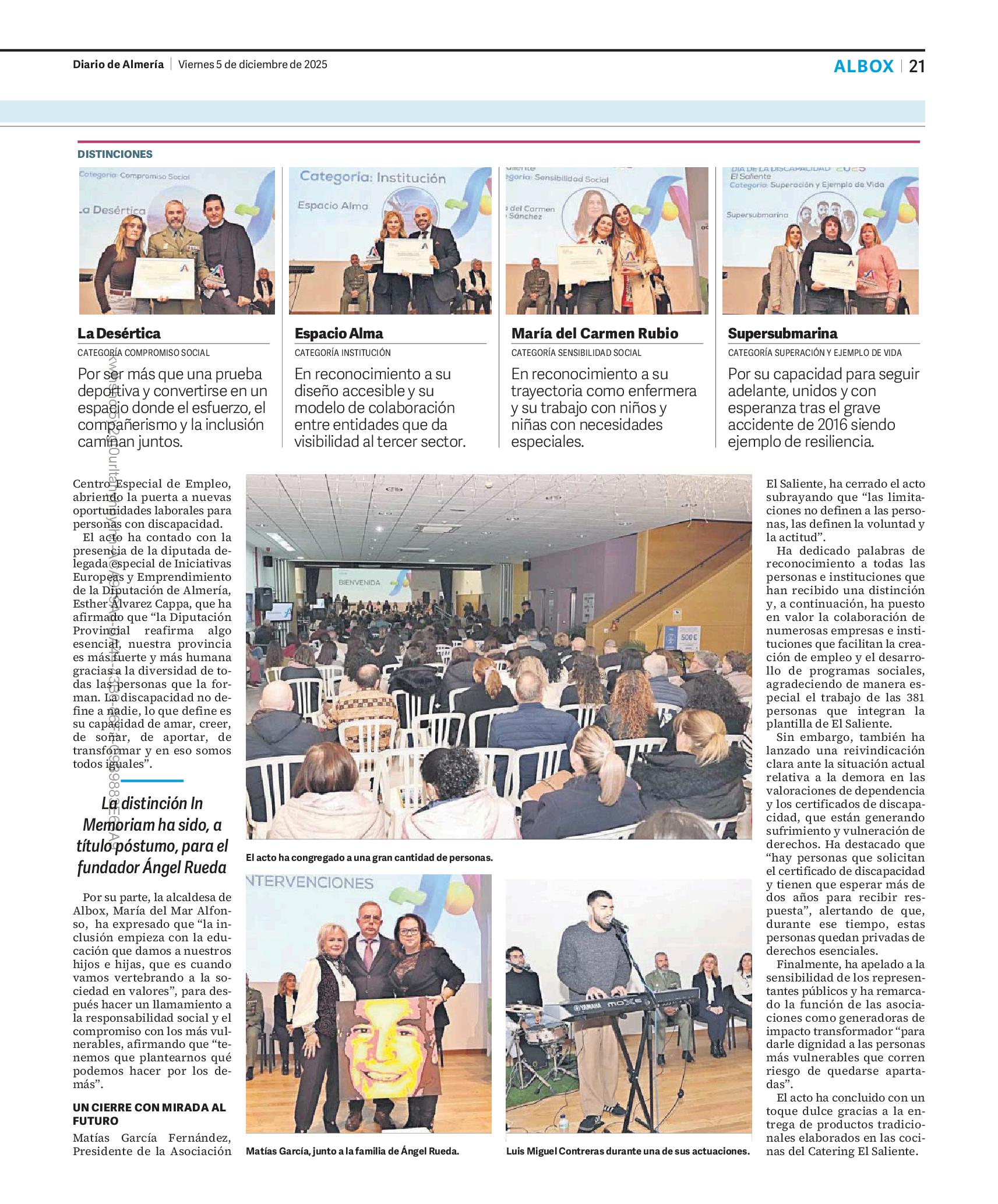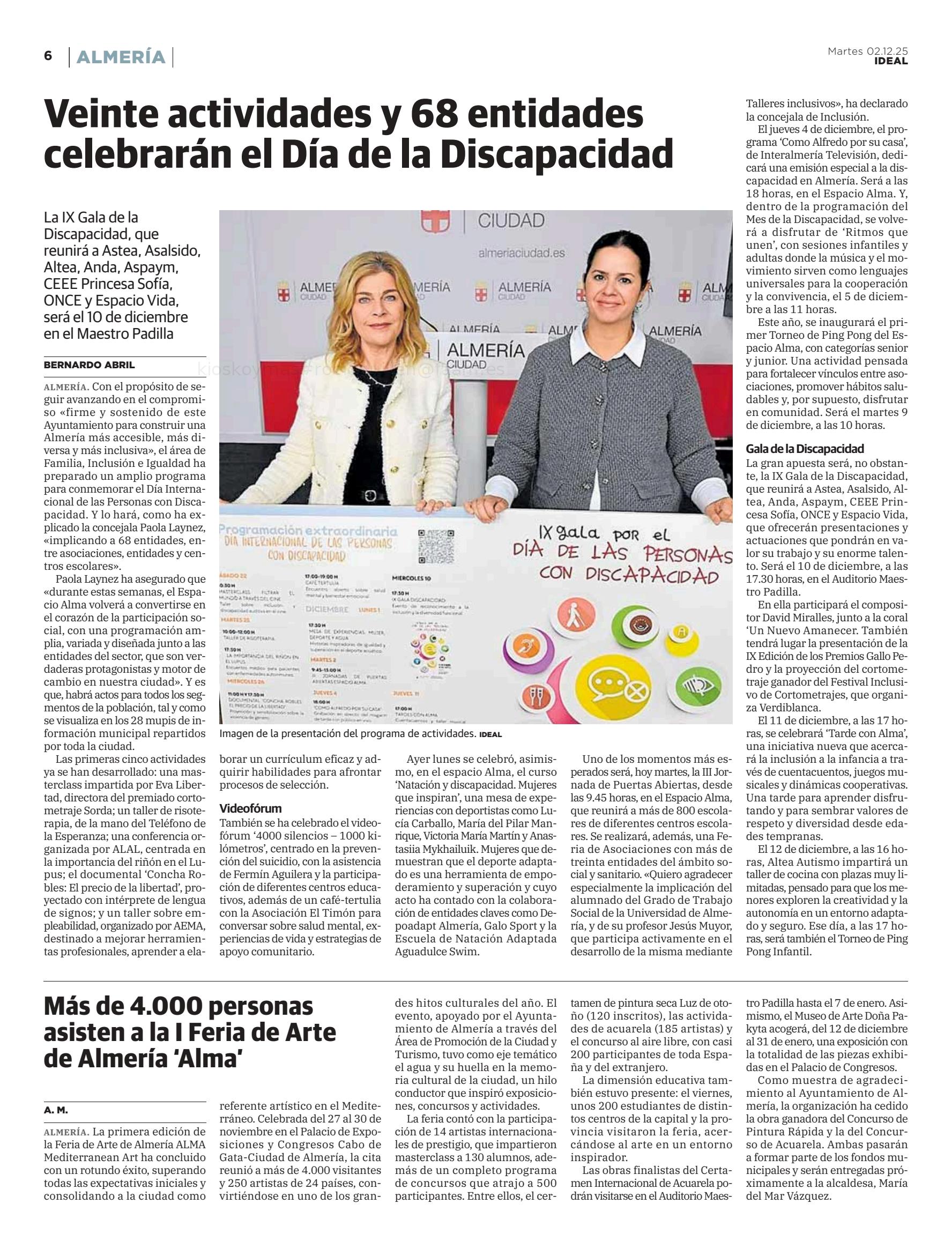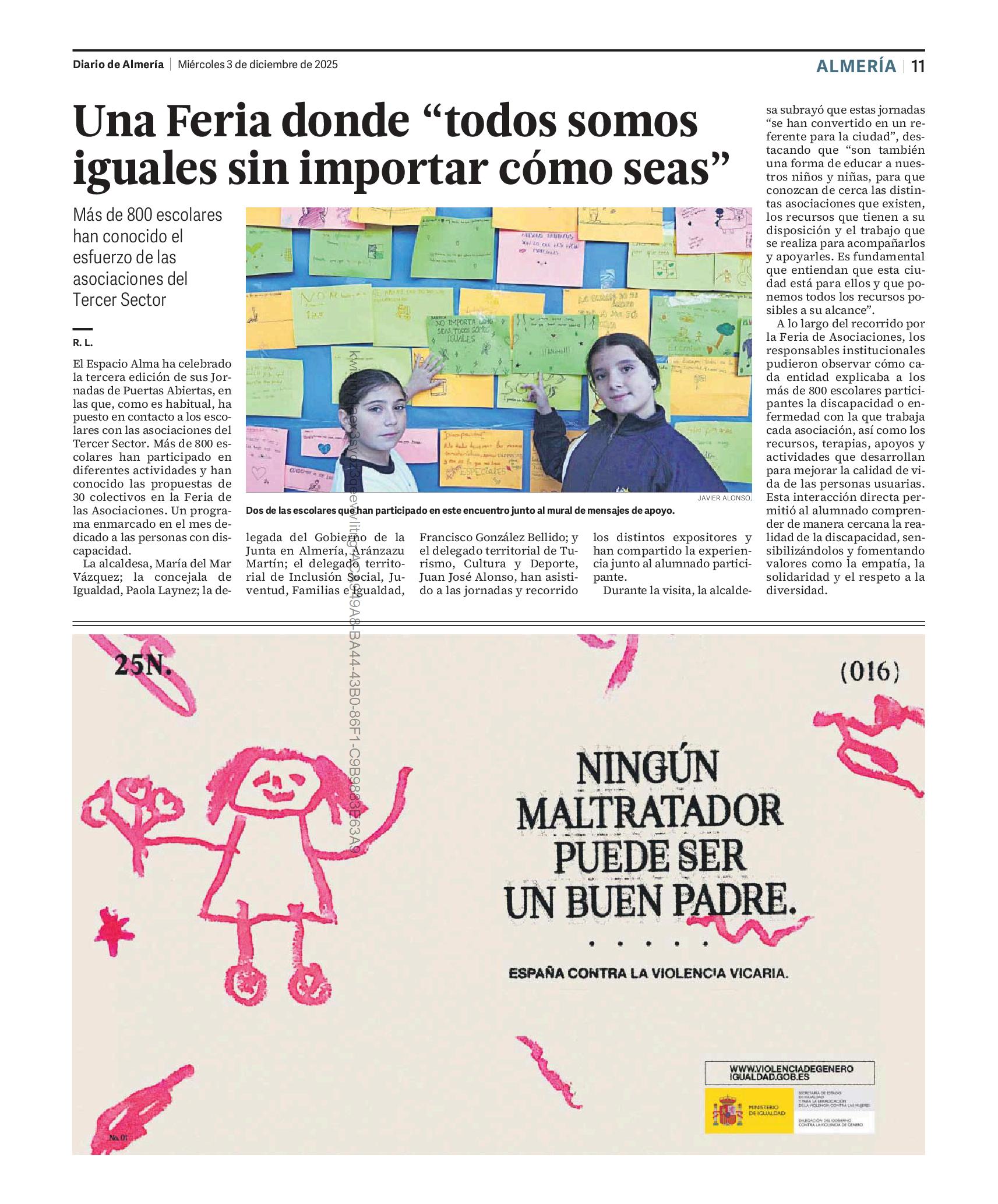 personal, eliminando tanto las barreras arquitectónicas como las mentales que la sociedad todavía impone. Desde la Diputación actuamos de forma transversal para igualar oportunidades en todos los municipios y construir una Almería más inclusiva, más igualitaria y, sobre todo, más solidaria”. Por su parte y para finalizar, ha intervenido Paola Laynez, concejal de familia del ayuntamiento de Almería resaltando el importante papel en la cohesión social que dibuja el tejido asociativo, el cual cuenta con el edificio Espacio Alma como lugar neurálgico de la discapacidad en la capital.