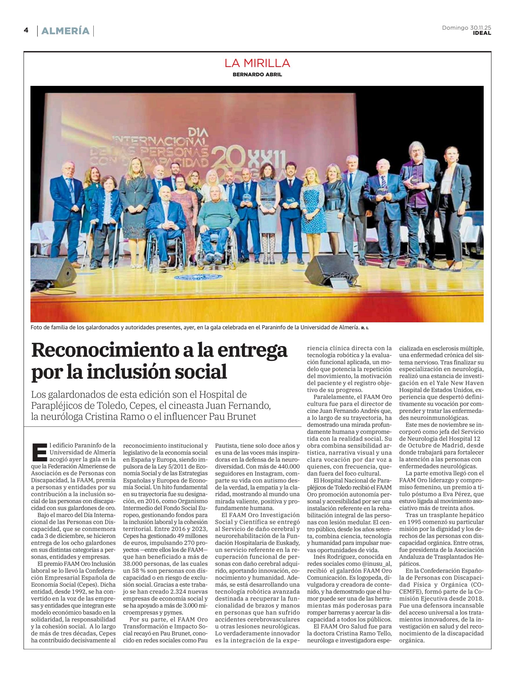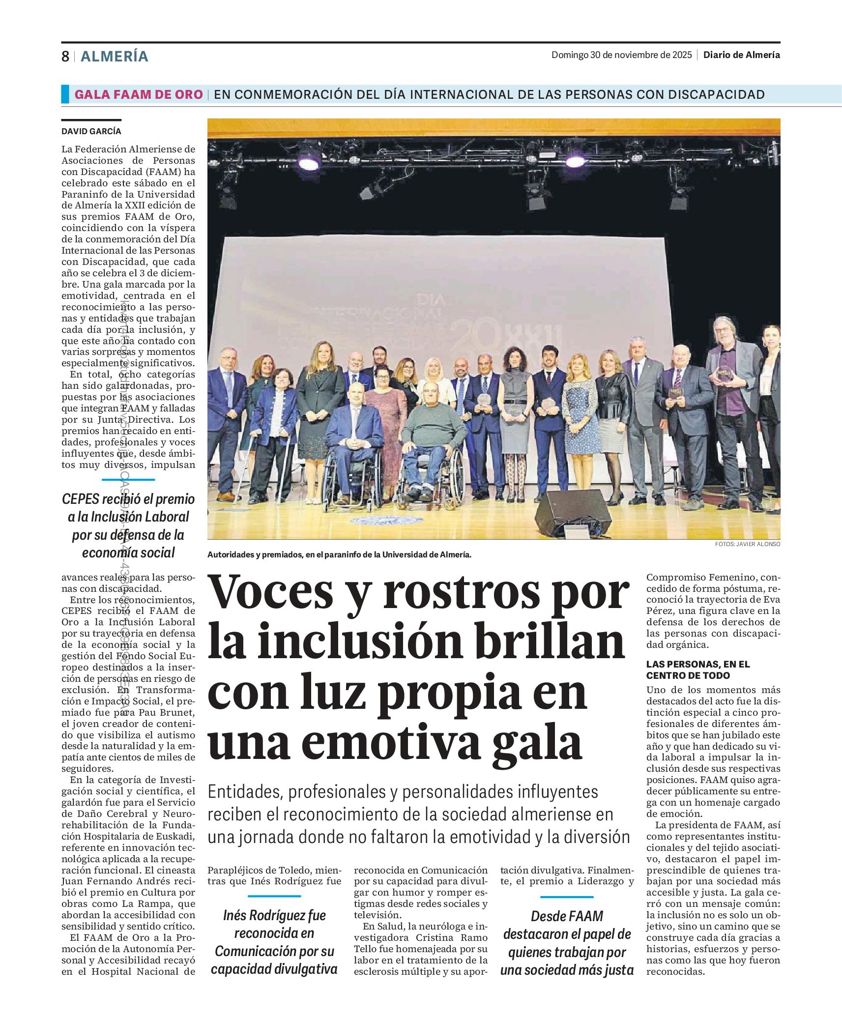 El hospital de parapléjicos de Toledo, CEPES, el director de cine Juan Fernando o la neuróloga Cristina Ramo están entre los premiados de la edición de la gala con motivo del Día Internacional de las Personas con Discapacidad, conmemorado cada 3 de diciembre. Es la fecha en la que la Federación Almeriense de Asociaciones de Personas con Discapacidad enmarca sus galardones FAAM de Oro, premios que este año alcanzan la edi -