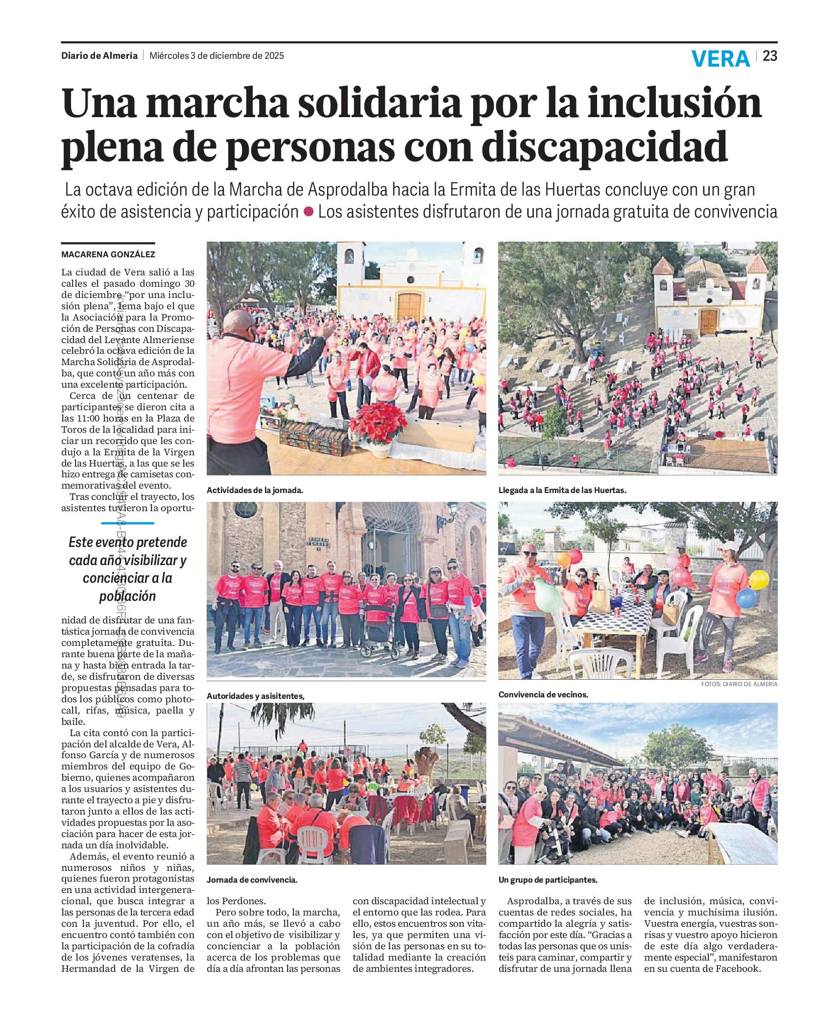 Con motivo del Día Internacional de las Personas con Discapacidad, conmemorado cada 3 de diciembre, la Federación Almeriense de Asociaciones de Personas con Discapacidad (FAAM) desarrolló un acto institucional que, por primera vez, se llevó a cabo de forma simultánea en cuatro municipios de la provincia donde la entidad cuenta con asociaciones miembro. Vélez Rubio con la partici-