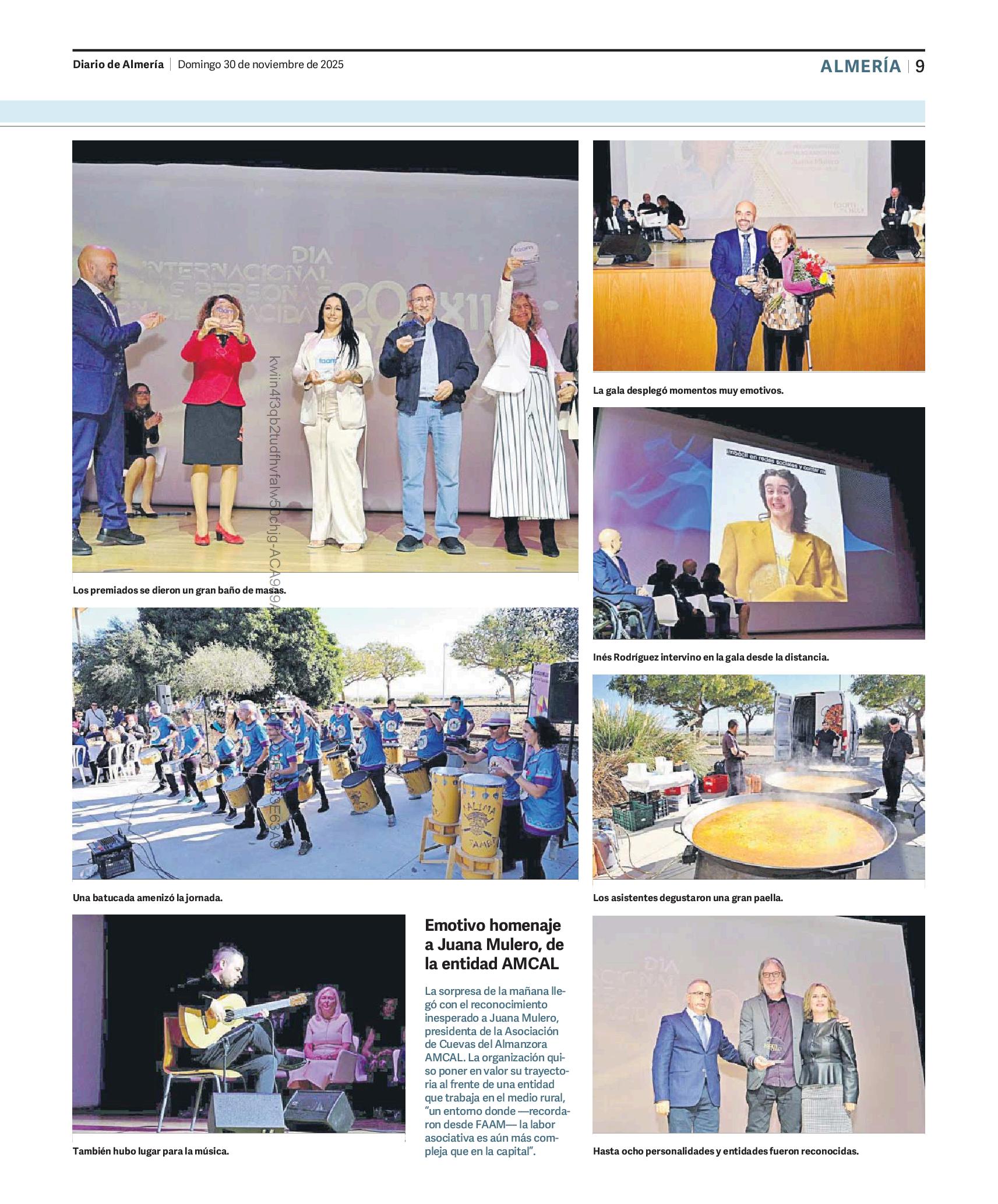 La sorpresa de la mañana llegó con el reconocimiento inesperado a Juana Mulero, presidenta de la Asociación de Cuevas del Almanzora AMCAL. La organización quiso poner en valor su trayectoria al frente de una entidad que trabaja en el medio rural, “ un entorno donde —recordaron desde FAAM— la labor asociativa es aún más compleja que en la capital”. Mulero recibió el aplauso más prolongado de la jornada, visiblemente emocionada.