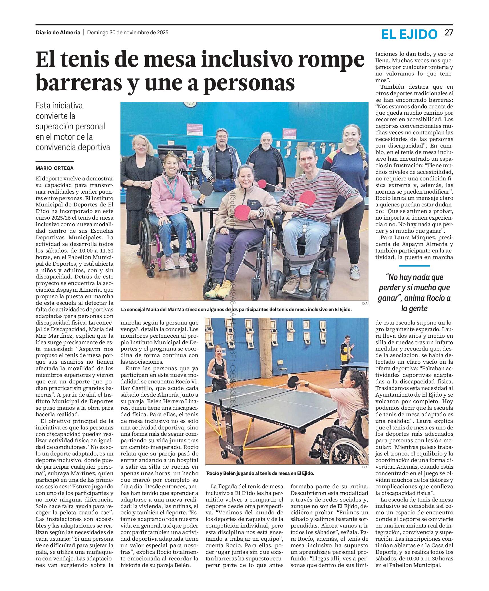 deramiento y superación. Esta actividad cuenta con la colaboración de entidades claves como Depoadapt Almería, Galo Sport y la Escuela de Natación Adaptada Aguadulce Swim. Uno de los momentos más esperados será la III Jornada de Puertas Abiertas, el 2 de diciembre desde las 9.45 horas. Este año se recibirá en el Espacio Alma a más de 800 escolares de diferentes centros escolares. Además, se realizará una Feria de