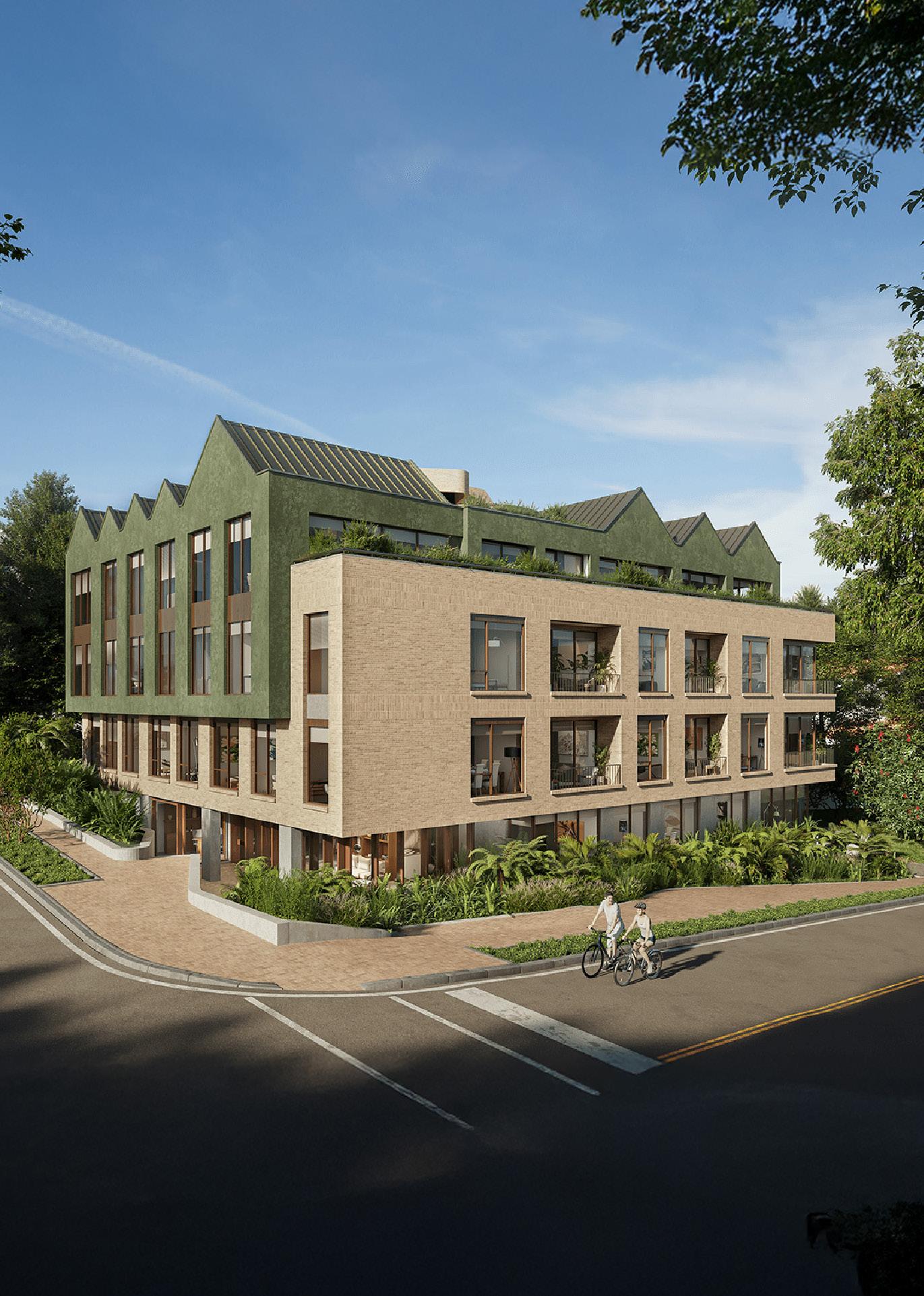 In accordance with local urban regulations and to ensure the project’s economic viability, the building takes advantage of the site’s natural topography. The entrance is thoughtfully submerged into the terrain, creating a sense of privacy and a smooth transition from the public space to the more intimate interior. Material choices further reflect a sensitivity to the context: concrete is used at the ground level, brick defines the main façade, and green stucco clads the upper floors, complemented by wooden window frames. These