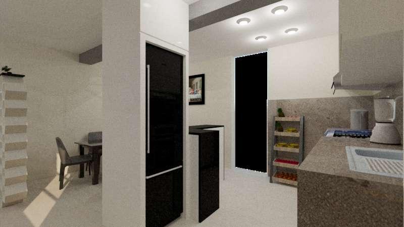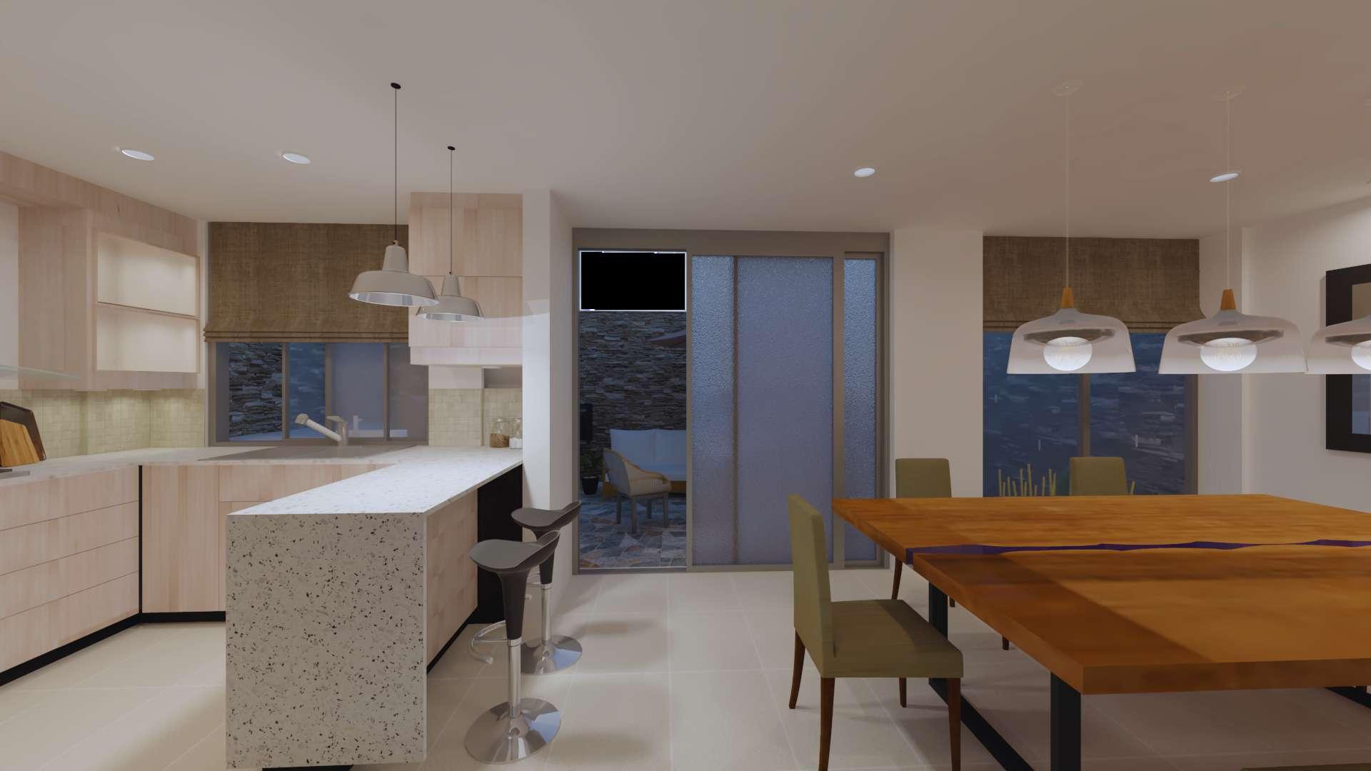 Comosegundaopcióndediseñosepresentouna cocinaconelmismoconceptoabiertoybarra para2personas,sololeplanteounadistribución demueblesdistinta.