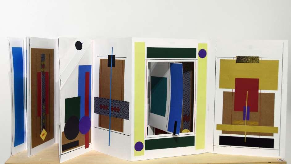 A paisagem pela janela: dobras, cortes e recortes colagem, carimbo e desenho sobre papel e papelão 23 x 27 cm | 21 x 18 cm (fechado) 2022