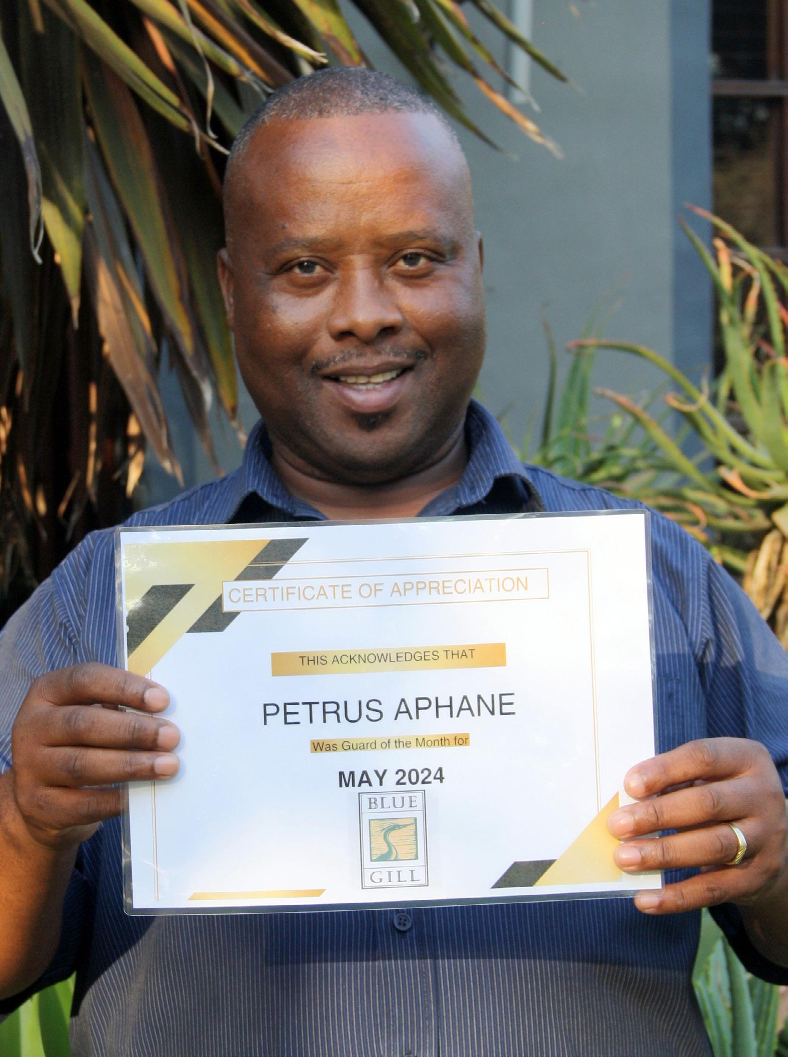 ABlue Gill employee since March 2010, is the Guard of the Month for April 2024. He is also one of the guards who noticed the two intruders attempting to climb over the wall of the property opposite the Blue Gill guardhouse. Thank you for your loyal service, Petrus. We appreciate you!