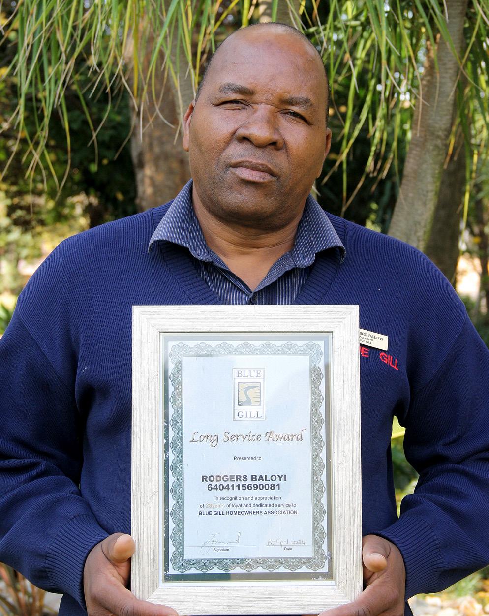 We would like to take a moment to honour our dedicated guard, Rodgers Baloyi, who recently retired. Rodgers served our community for an impressive 23 years and eight months, having been permanently appointed by Blue Gill HOA on 1 August 2001. Prior to his permanent appointment, Rodgers worked for Prisma Security, which was contracted to Blue Gill Estate for three years. Married