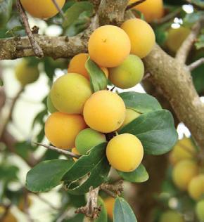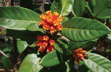 A shrub or small tree with trifoliate leaves and mottled bark. Although tiny, the pale green flowers are exquisite and occur from August ‘til January. The gorgeous orangey red fruits attract birds and monkeys.