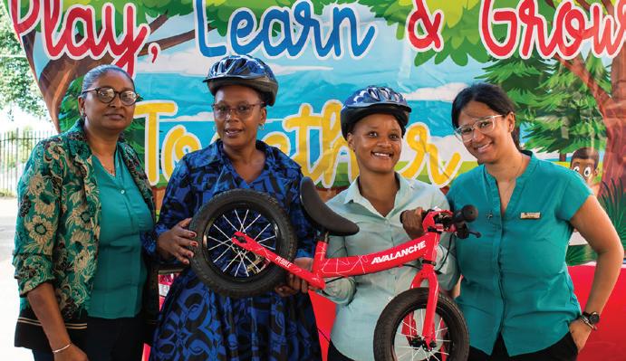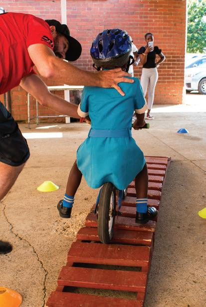 up, then jump onto the bikes for 30 minutes, working on different skills every week.” The lessons teach leadership, accountability, discipline when packing away equipment, and affirmation when coaches compliment the learners. “The last thing is manners: each child must shake the coach’s hand, look them in the eye and thank them for the lesson.”