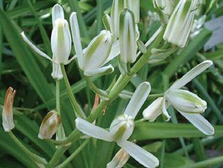 Easily grown, this is a showy plant with erect white flowers with green bands. The clusters of bulbs with their long shiny leaves are attractive. The eastern dune mole-rats rather enjoy these bulbs.