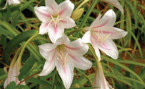 An ornamental garden plant that prefers damp soil and develops large bulbs. The leaves die down in winter, but in early summer the neck of the bulb elongates producing a skirt of large leaves. The erect flower stalk is a metre high with a crown of about ten large, light-pink tubular flowers. Planted in a group, they are spectacular. In hot day-time weather the flowers may droop but become upright and open in the evening.