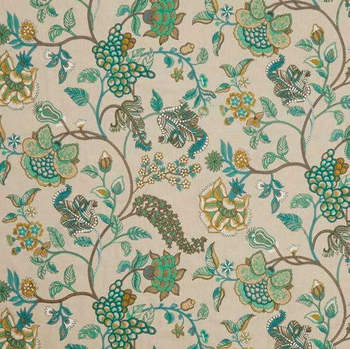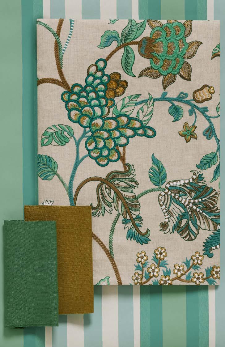 CYPRESS STITCH Inspired by a collection of mid-19th century hand-painted shawls from the Liberty archive, Cypress Stitch offers a striking rendition of the cherished Persian Voyage design. Now rendered for the first time as a beautiful densely embroidered fabric, Cypress Stitch is a truly spectacular botanical paisley of tropical palms, feathery fronds, and graceful ferns. Embroidered using matte yarns on a rich cotton base, suitable for light domestic upholstery, drapery, cushions, and accessories. Cypress Stitch is an interpretation of Cypress Voyage, a sumptuous wallpaper design in the Botanical Atlas collection, printed on grass cloth in four colour stories. (Skerne)