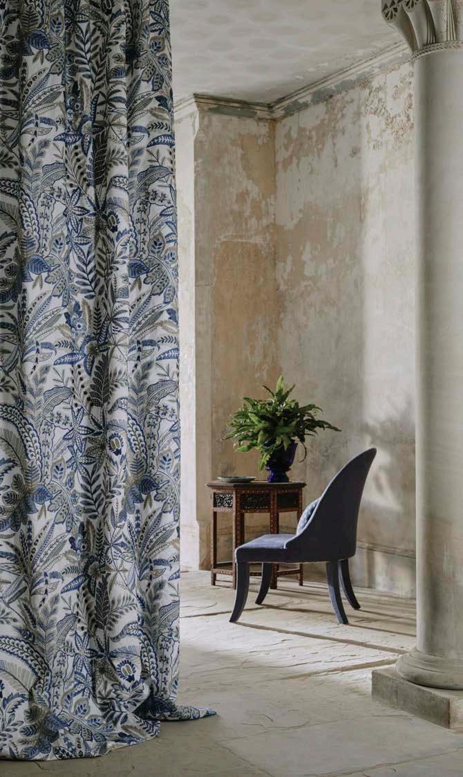 PORCELAIN TRAIL Porcelain Trail is inspired by a hand-painted furnishing design, originally printed for Liberty during the late 1960s. Exquisitely redrawn, resized, and recoloured, this ornate floral pattern is bathed in a beautiful soft light which accentuates the nuanced tones and textures of the design. Its winding branches are dotted with blossom flowers and spectacular chrysanthemums, combining directional design, artistry, and innovation. Printed on 100% linen and a rich sumptuous velvet, suitable for upholstery, drapery, cushions, and accessories. (Guro, Downley)