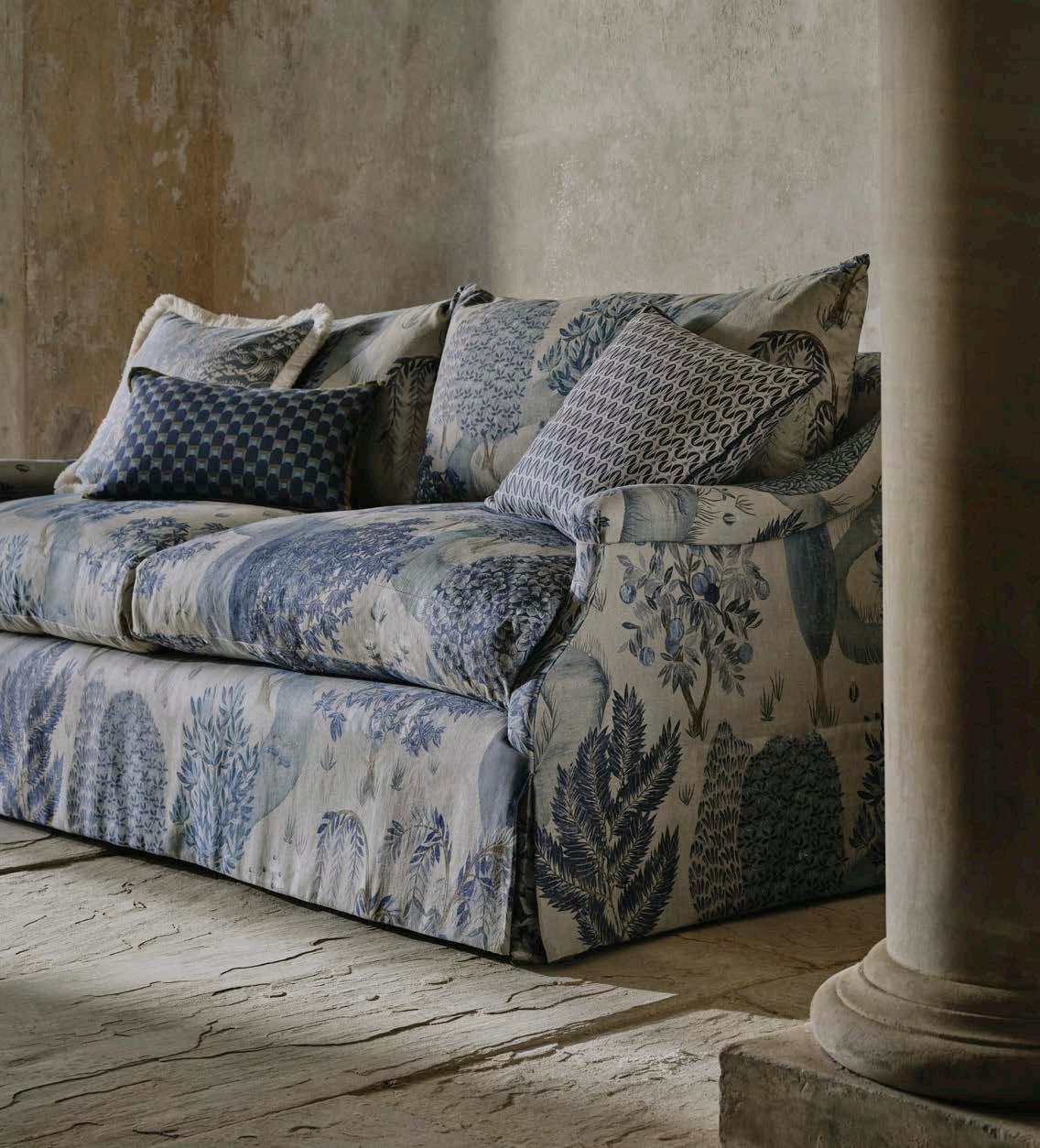 ENCHANTED WOOD A panoramic voyage across an imagined landscape, this captivating design was inspired by the book, ‘Around the World in 80 Trees’ by Jonathan Drori. Hand-painted in the Liberty Design Studio in a style influenced by miniature Indian garden paintings, Enchanted Wood integrates stylised trees from all over the world including maple, cypress, willow, orange, and pear. Weaving through these lush woodlands are meandering streams, delicate grass, and even an imagined Liberty floral tree. Printed in Italy on 100% linen with a heavy drape and a soft tumbled finish. Suitable for upholstery, drapery, cushions, and accessories. Also available as a wide width wallpaper design in two distinct colourways. (Wycombe)