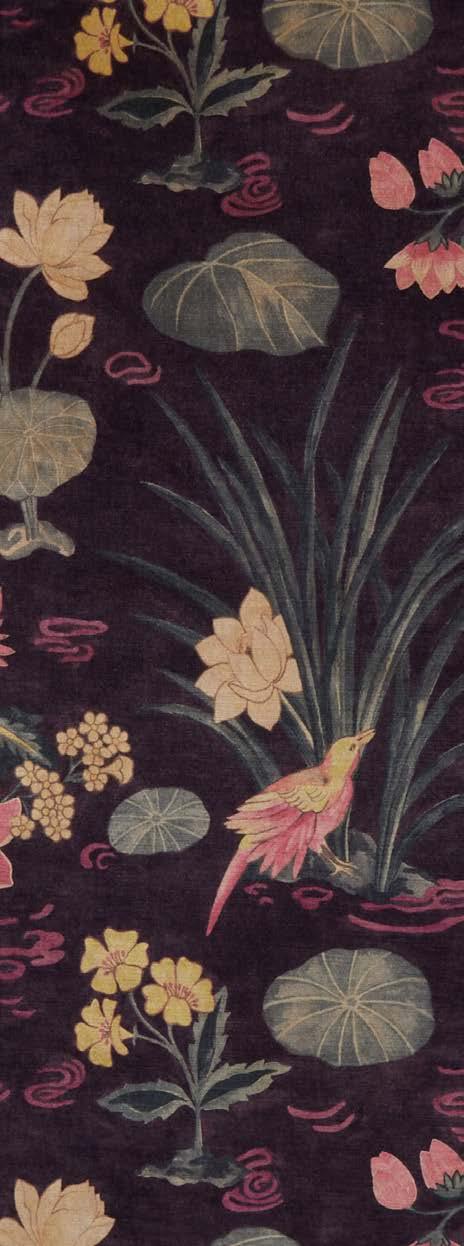 LOTUS GARDEN Lotus Garden is inspired by an original artwork from Liberty’s extensive archive. Layered with an exquisite variety of Asian-inspired motifs, the original design features calm waters peppered with blooming irises, peonies, and chrysanthemums, watched over by handsome Kingfishers. Repainted and reworked by the Liberty Design Studio, Lotus Garden is printed on a richly textured, soft velvet base, used to enhance the beautifully vibrant hues of the design’s three colourways. With super abrasion and exquisite drape this fabric is suitable for upholstery, drapery, cushions, and accessories. (Downley)