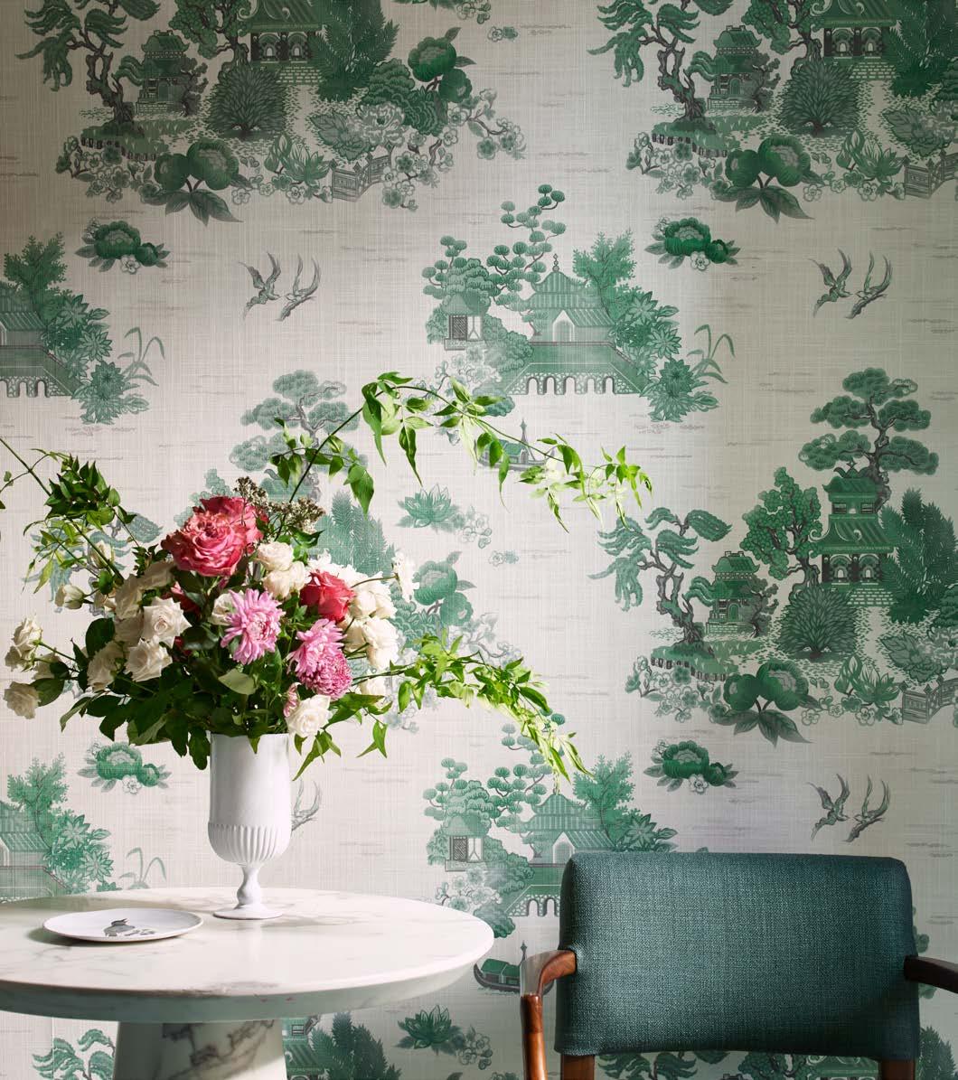 This magnificent landscape was originally printed as a Liberty furnishing fabric during the 1970s. Incorporating new stylistic elements, and recoloured in tonal and harmonious palettes, the design is inspired by traditional Chinoiserie wallpaper panels from the 17th & 18th centuries. Repainted and adapted by the Liberty Design studio, intriguing islands unfold filled with lush gardens, oversized Lotus flowers, fantastic pavilions, floating sampans, and birds in flight. Printed on a paper backed linen providing a fresh, contemporary ground with tonal jade tones layered on top.