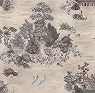 This magnificent landscape was originally printed as a Liberty furnishing fabric during the 1970s. Incorporating new stylistic elements, and recoloured in tonal and harmonious palettes, the design is inspired by traditional Chinoiserie wallpaper panels from the 17th & 18th centuries. Repainted and adapted by the Liberty Design Studio, intriguing islands unfold filled with lush gardens, oversized Lotus flowers, fantastic pavilions, floating sampans, and birds in flight. Printed on a textural fibrous metallic base, providing richness and depth reminiscent of antique lacquerware and delicate glass.