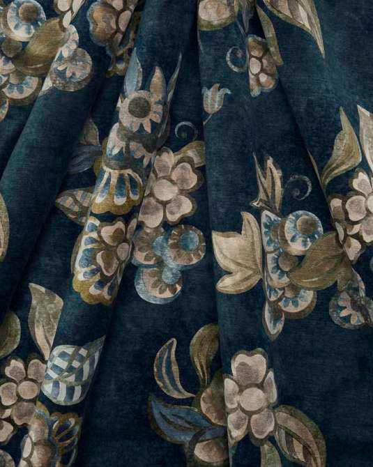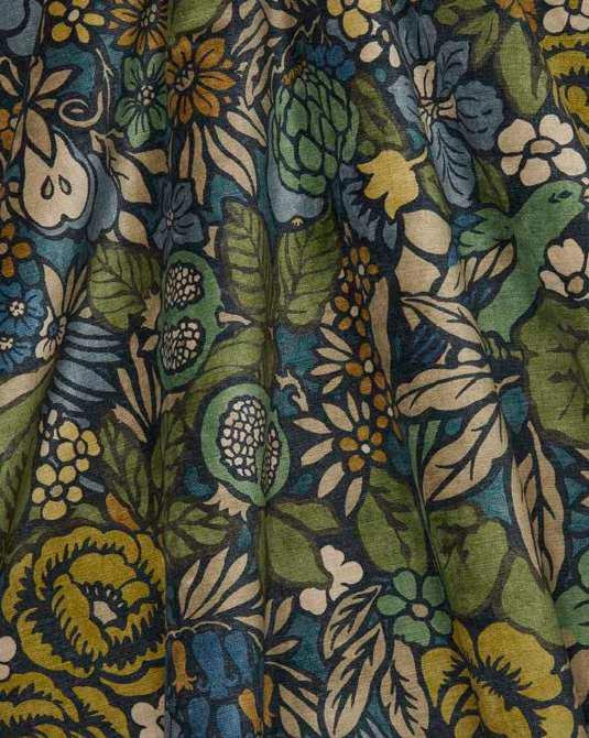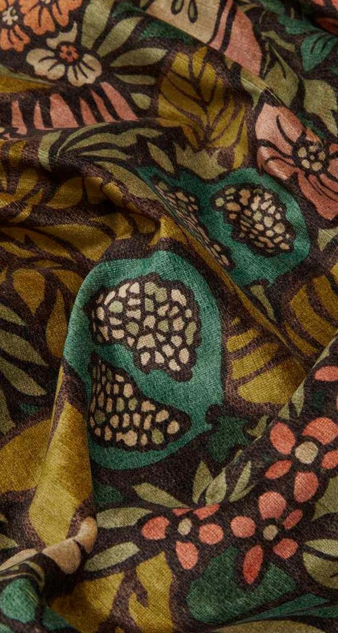 Pomegranate Garden was originally created in 1965 under the creative direction of former Design Director, Bernard Nevill, as part of the trendsetting ‘Lotus’ collections of the 1960s. Meticulously redrawn and reimagined into a stylised representation of a blossoming orchard, this eclectic pattern softens bold outlines with delicate textures. Camouflaged birds nestle amidst lush foliage, while roses, tulips, irises, and bluebells intertwine with vibrant accents of delectable fruits. Printed on Liberty’s signature velvet, this fabric is suitable for upholstery, drapery, cushions, and accessories.