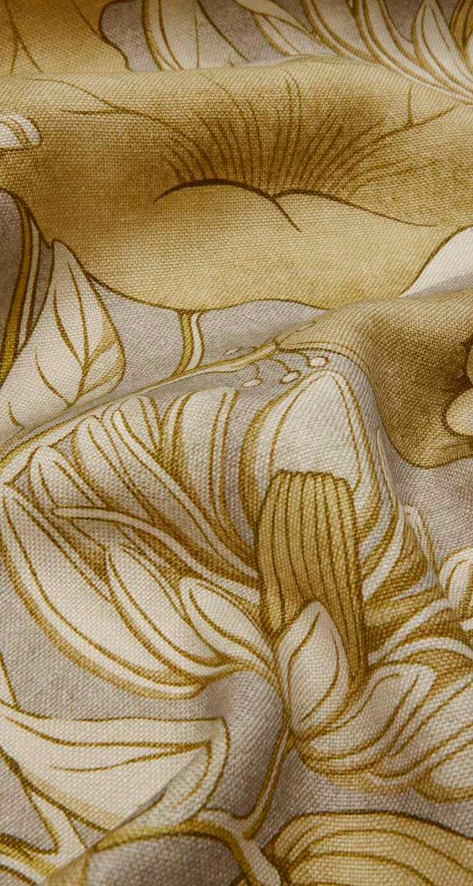 Adapted from a series of small textile fragments discovered in the Liberty archive dating from the early 1900s, this statement print conjures up a dreamy, Art Nouveau-style aesthetic. Reimagined using a selection of additional natural motifs, striking trails of fluttering lotus flowers, leaves, and seed pods intertwine in an almost choreographed dance, while subtle nuances in tonality add texture and depth. Printed on a 100% linen base and a sumptuous velvet blend, Wilde Lotus is appropriate for upholstery, drapery, cushions, and accessories.