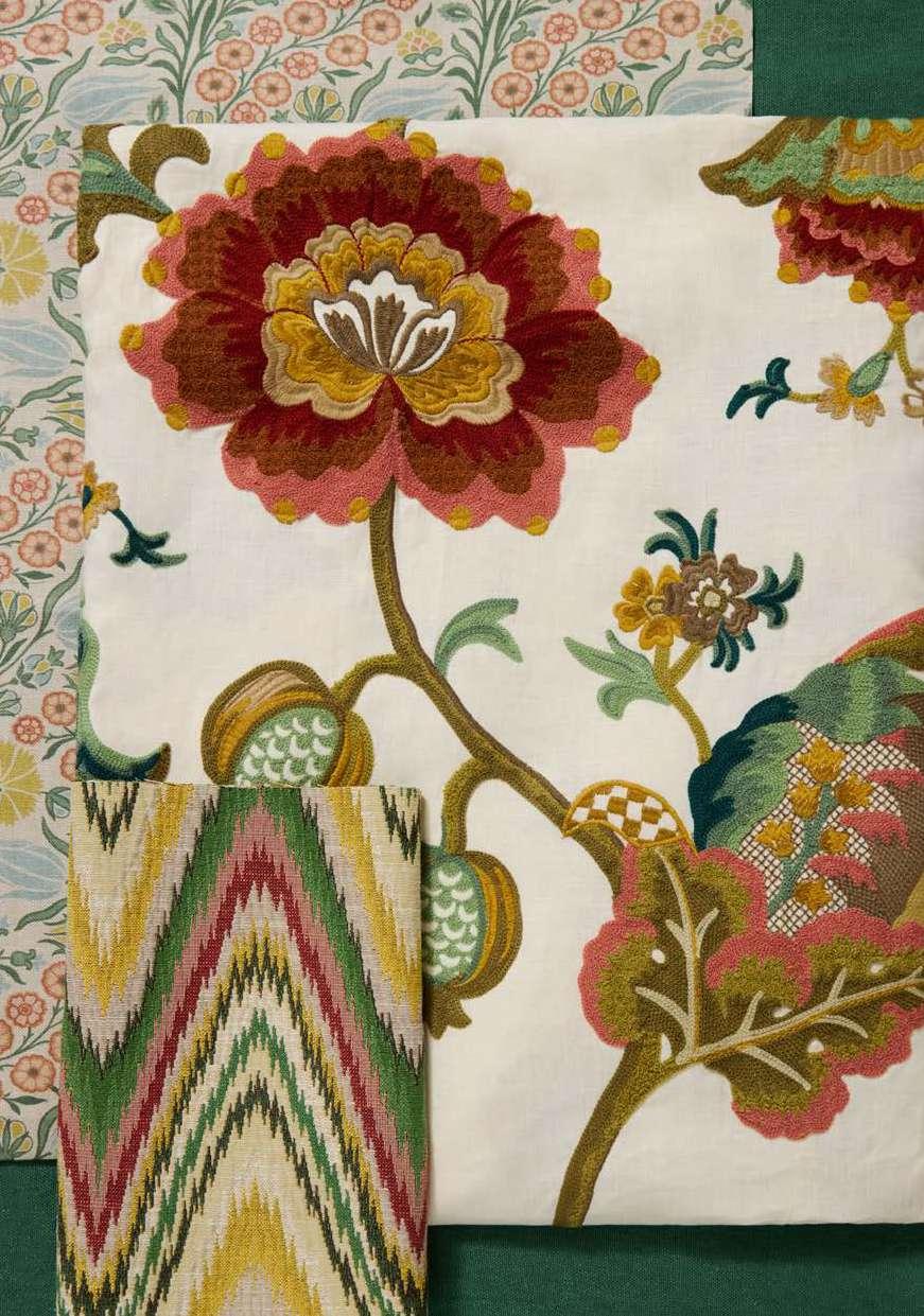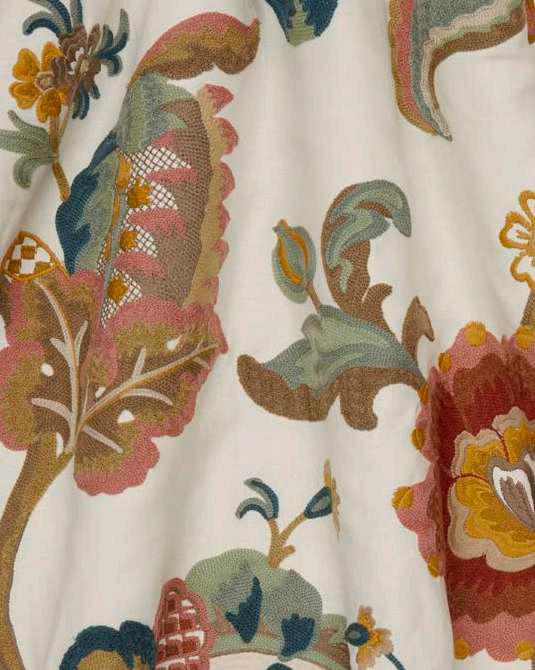 Drawing inspiration from a collection of Jacobean-style, hand-painted artworks discovered in the Liberty archive, this striking ornamental embroidery showcases the grandeur of early 17th century textiles. Oversized flowers enveloped by lush foliage are depicted in refreshing hues and arranged in a trailing Tree of Life-style pattern, highlighting the richness of flow and form. Carefully crafted by expert embroiderers in India using brightly hued yarns, Eden Stitch is ideal for upholstery, drapery, and cushions.