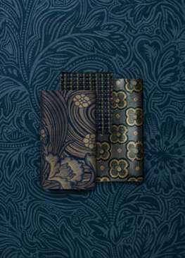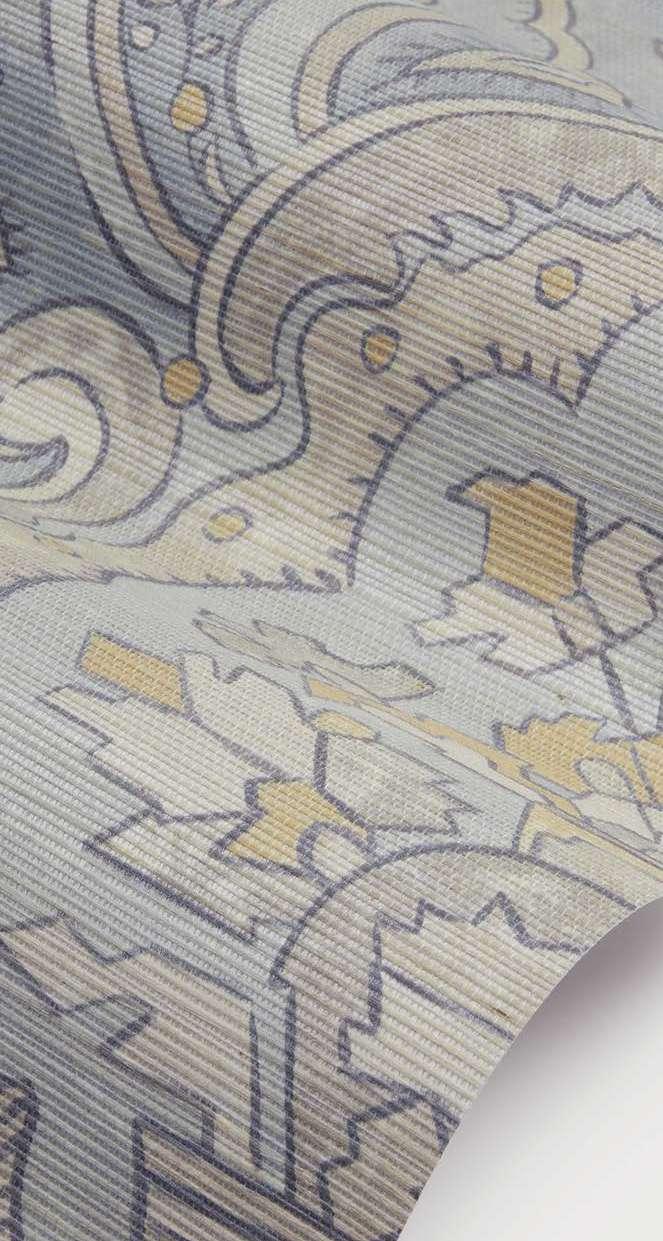 With strong influences from traditional Persian and Islamic design aesthetics, this richly decorated botanical pattern, originally created by Liberty in 1965, seamlessly blends stylised florals with subtle geometric elements. Reminiscent of the exquisite Persian rugs sold at specialist rug department in the Liberty flagship store, Charlton’s intricate shapes follow a symmetrical, tile-like layout. Printed on a lustrous, pearlescent grass-cloth base, each motif is encased within ornate, accentuated frames.