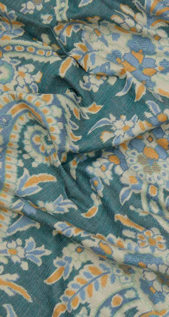 Discovered in one of Liberty’s archival pattern books, Paisley Willow is a weave interpretation of Palm Willow. Carefully redrawn and reimagined to preserve the exquisite intricacy of the original design. This traditional paisley floral, infused with a tropical twist, features an abundant garden of trailing vines, feathery fronds, and jewel-like blossoms, all nestled among elegant boteh paisleys. Crafted from Tana Reborn Eve, an innovative approach to transforming surplus fabrics. Paisley Willow is warp printed on 20% recycled cotton, offering a blurred ikat effect, suitable for light upholstery, drapery, cushions, and accessories.