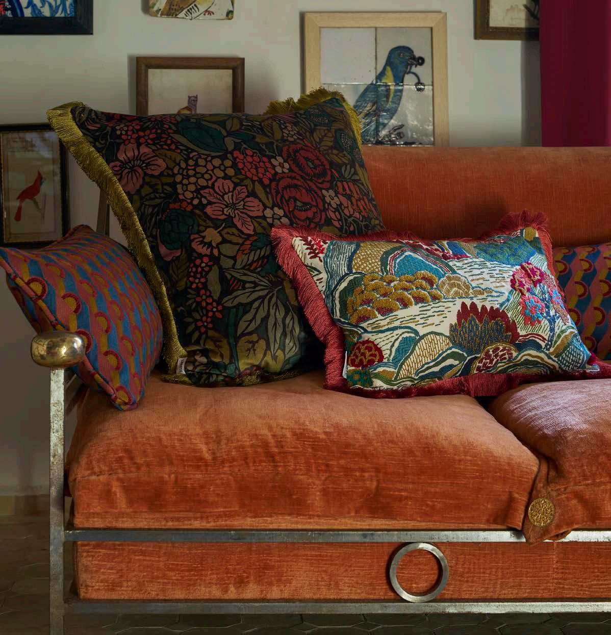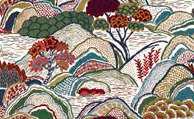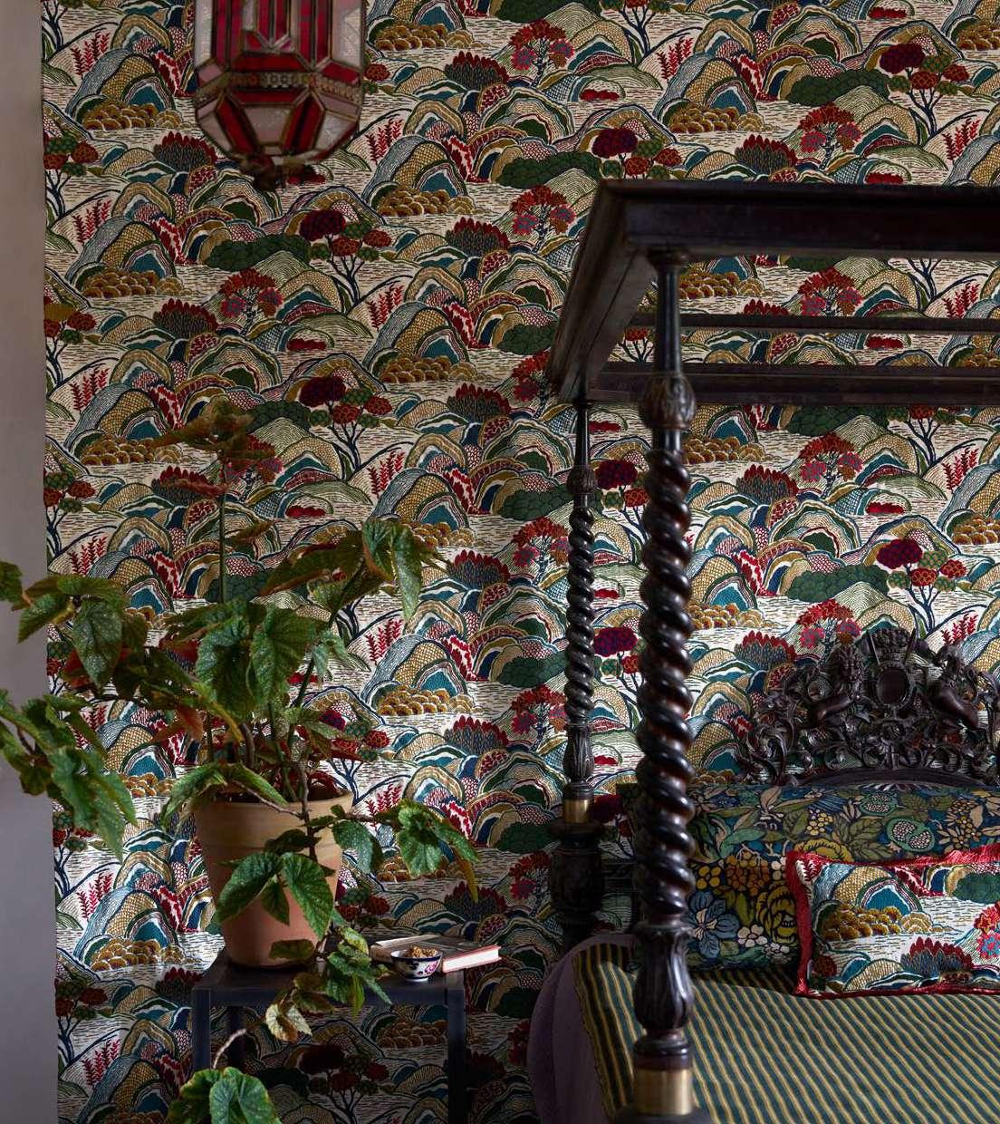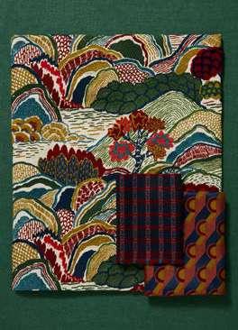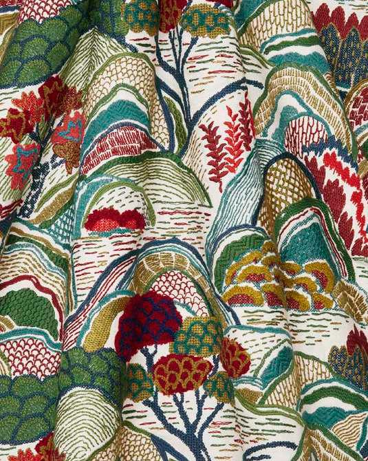 Inspired by Japanese mountainscapes and ancient forests, this dramatic scenic embroidery perfectly complements the printed arboreal and floral artworks in the collection. Created in synergy to Bernard Nevill’s experimental 1960s luscious landscapes and botanical motifs, Mount Stitch is densely embroidered with beautiful boucle yarns. Suitable for upholstery, drapery, cushions, and accessories.