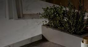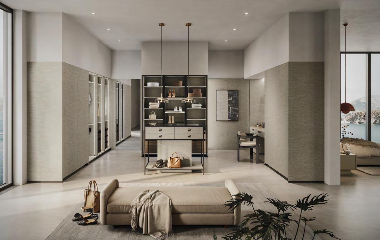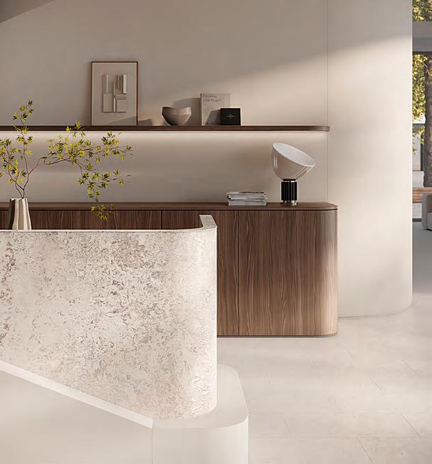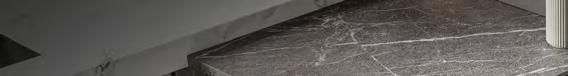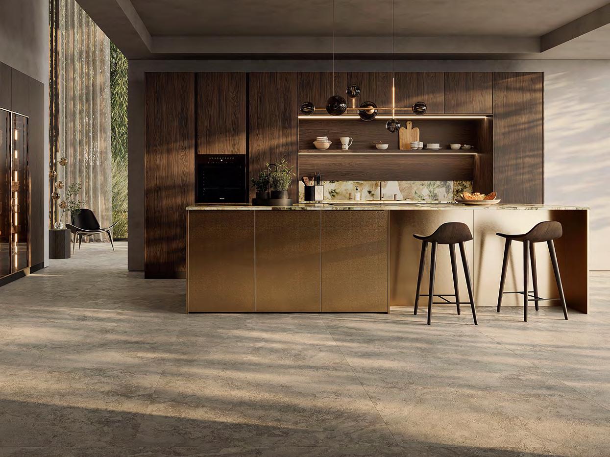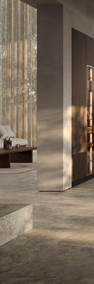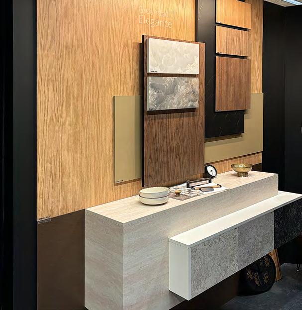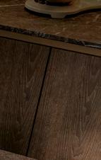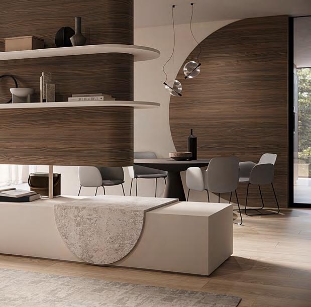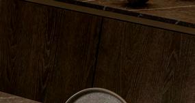 GROUNDED ELEGANCE – Hier rücken Materialgewicht und Präzision stärker in den Fokus. Lineare, handwerklich anmutende Holzoptiken werden mit klassischen Materialien wie Travertin und Marmor kombiniert.