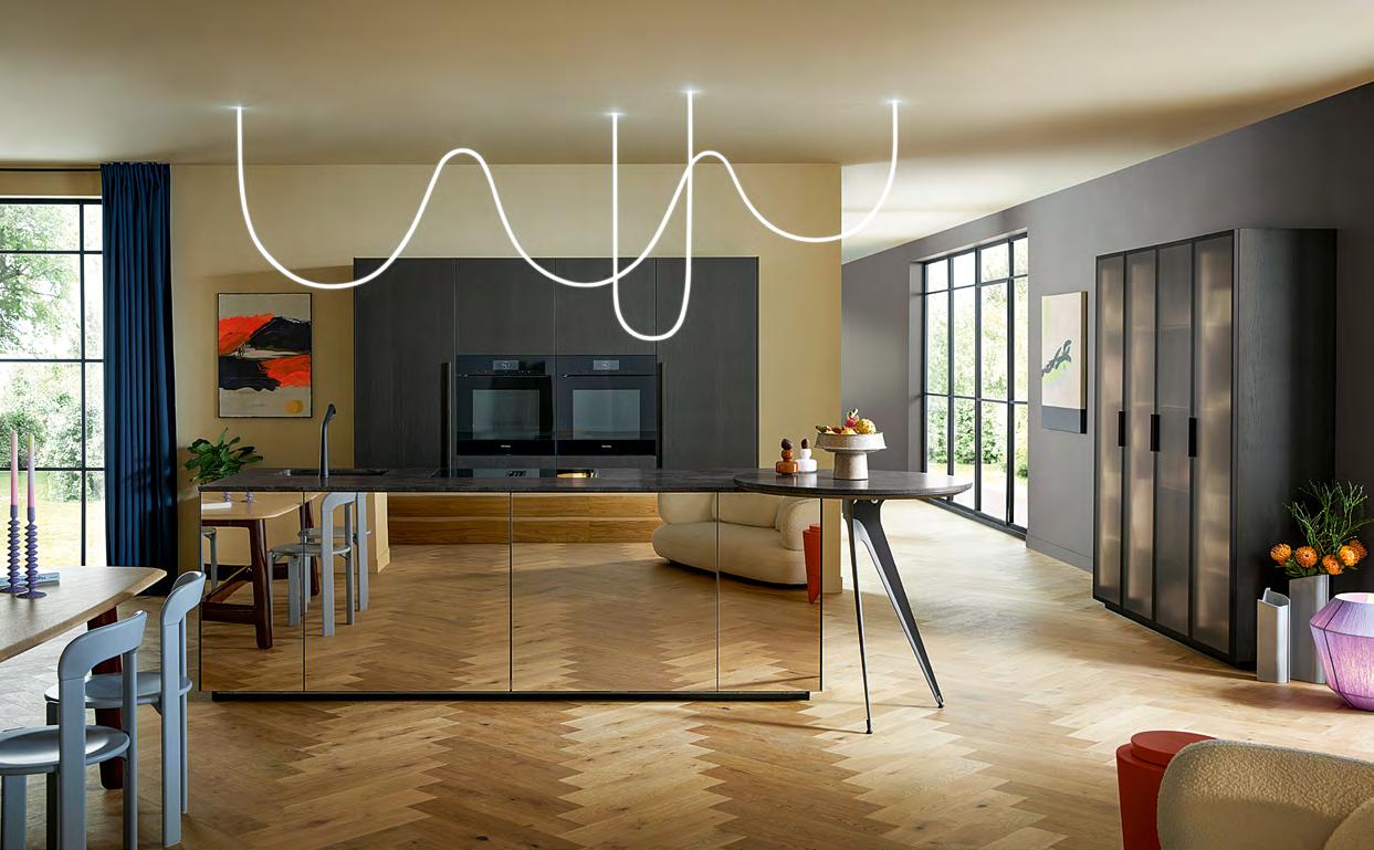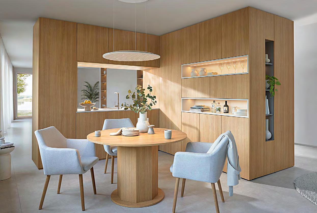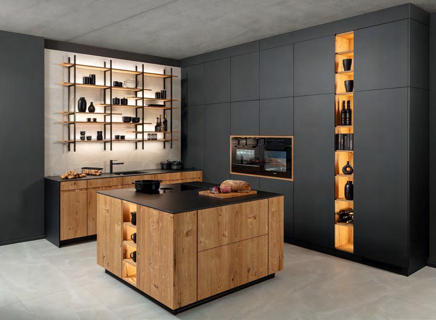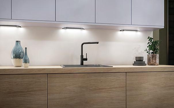 Licht wird im Katalog 2026 als integraler Bestandteil der Raumplanung verstanden. Das weiterentwickelte LUMICA® MEC LEDSystem ermöglicht vernetzte Beleuchtungslösungen bis hin zur Integration in SmartHomeAnwendungen auf Basis von ZigBee 3.0. Ergänzt wird das Sortiment durch das „Lucento“ Reling und LEDLichtsystem aus Aluminium mit schwarzer Oberflächenveredelung. Es kombiniert offene Aufbewahrung, Beleuchtung und Gestaltung in einem modularen Ansatz – insbesondere für Nischen und offene Küchenarchitekturen.