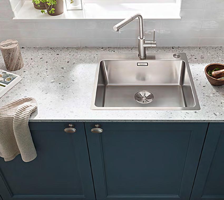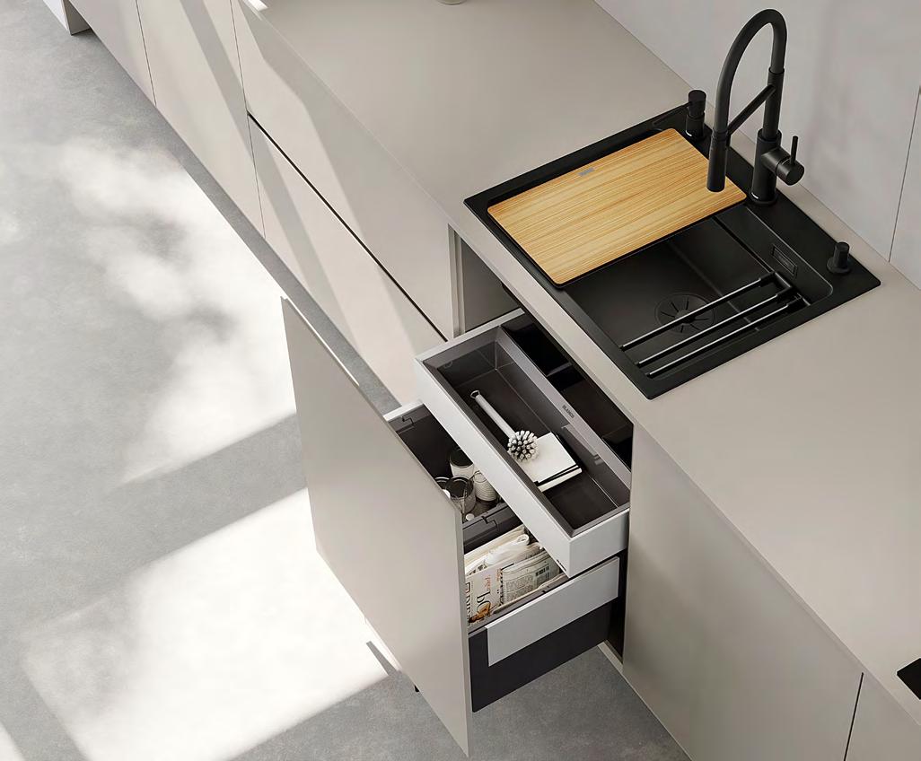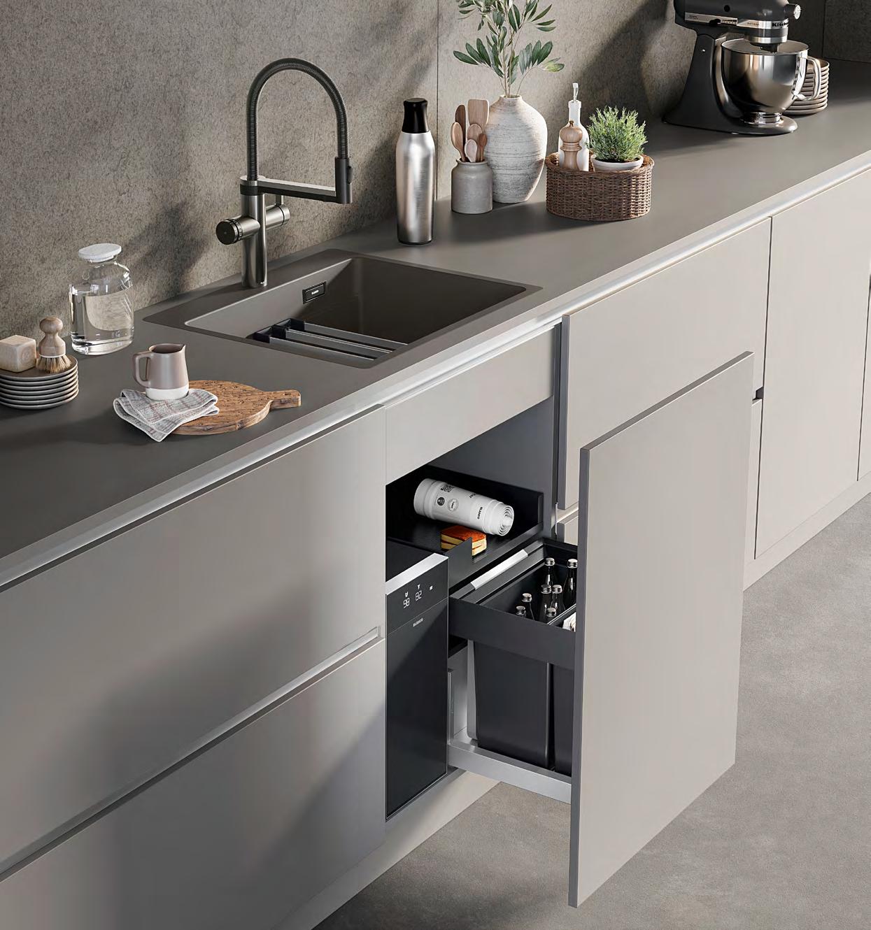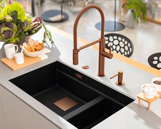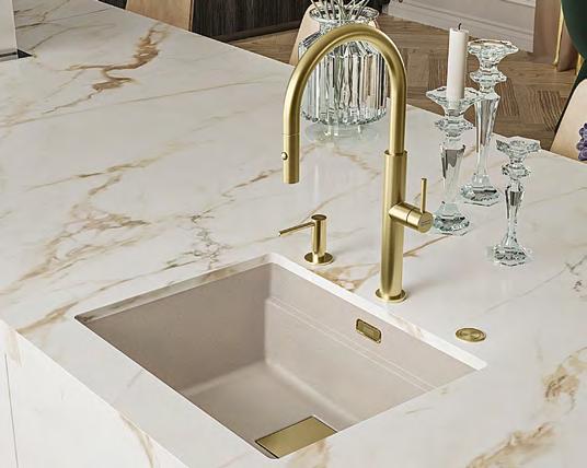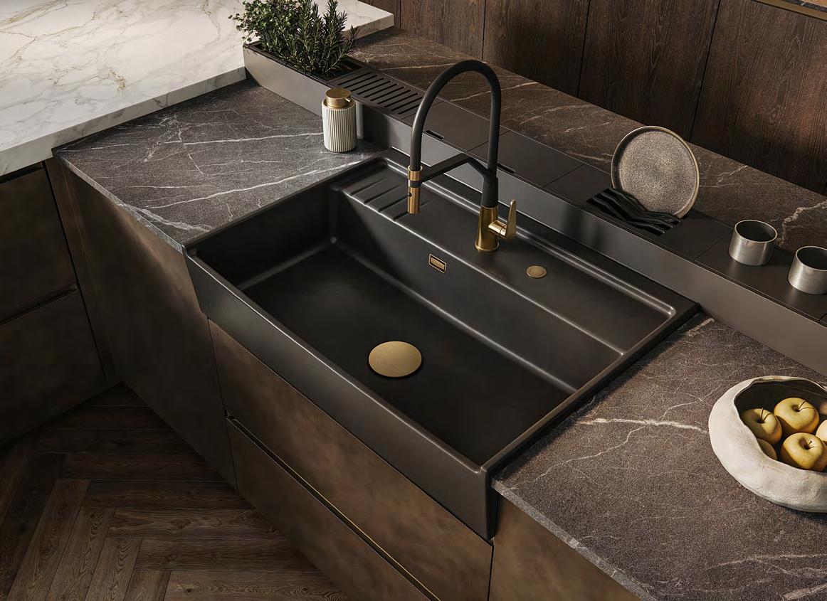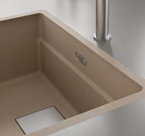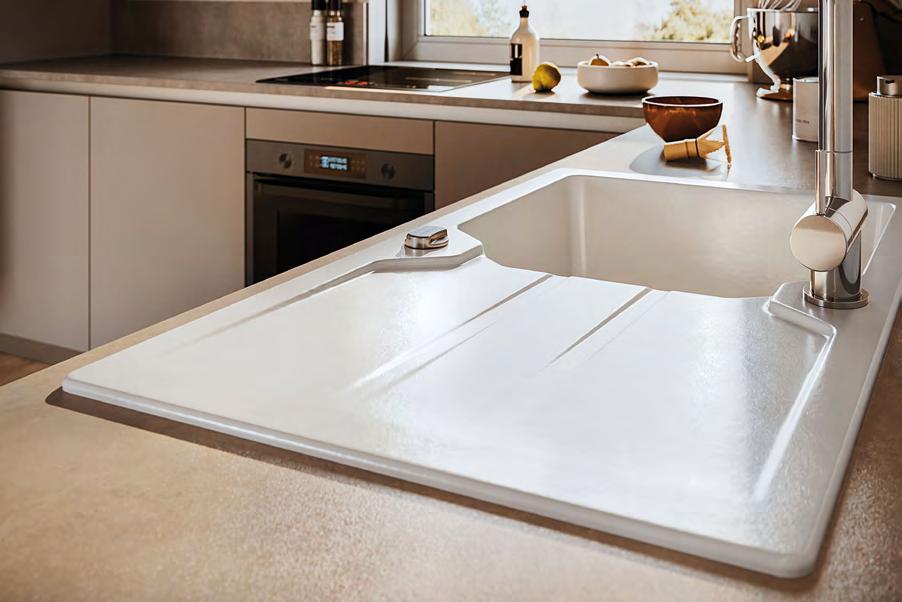 Composite erhältlich und lässt sich aufliegend, flächenbündig oder als Unterbau realisieren – ein entscheidender Vorteil für unterschiedliche Arbeitsplattenmaterialien und Planungsansätze. Ergänzt wird das Portfolio durch neue CompositeSpülen der NABERCONTURA® Serien, die sich durch hohe Widerstandsfähigkeit, seidige Haptik und anhaltende Farbbrillanz auszeichnen. Neue Farbnuancen wie marmoriertes Weiß, lichtes Grau, schimmerndes Braun und sattes Schwarz eröffnen zusätzliche Spielräume für die Küchengestaltung.