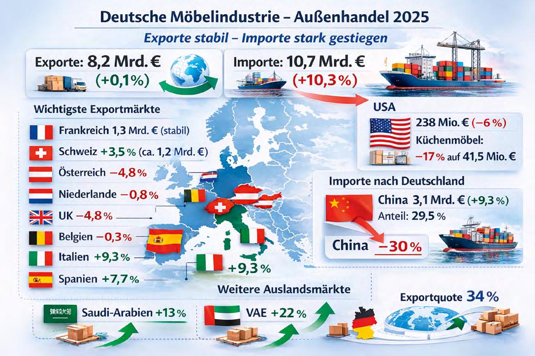 Seite 06/07: ChatGPT Images auf Basis der Pressemitteilung nr. 052 vom 18.02.2026 des Statistischen Bundesamts (Destatis) Seite 09: ChatGPT Image nach vorläufigen außenhandelsdaten des Statistischen Bundesamts (Destatis) sowie angaben der verbände der Deutschen Möbelindustrie, Pressemitteilung vom 24.02.2026