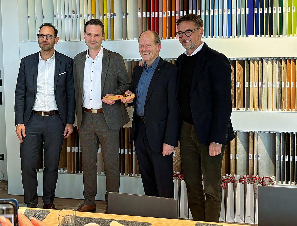 EIN STARKES TEAM MIT KLAREN ROLLEN: (V.l.n.r.) Michael Bernd Wehmeyer, Leiter Vertrieb und Marketing des Geschäftsbereichs Decorative Products Central der Egger-Gruppe, Matthias Wombacher, verantwortlich für Design & Decor Management der Egger Gruppe, Klaus Monhoff, langjähriger Leiter des Designmanagements bei Egger, und Roland Auer, Chief Marketing Officer der Egger Gruppe, – vereint strategische Marktkompetenz, gestalterische Exzellenz, langjährige Designexpertise und übergeordnete Marketingführung.