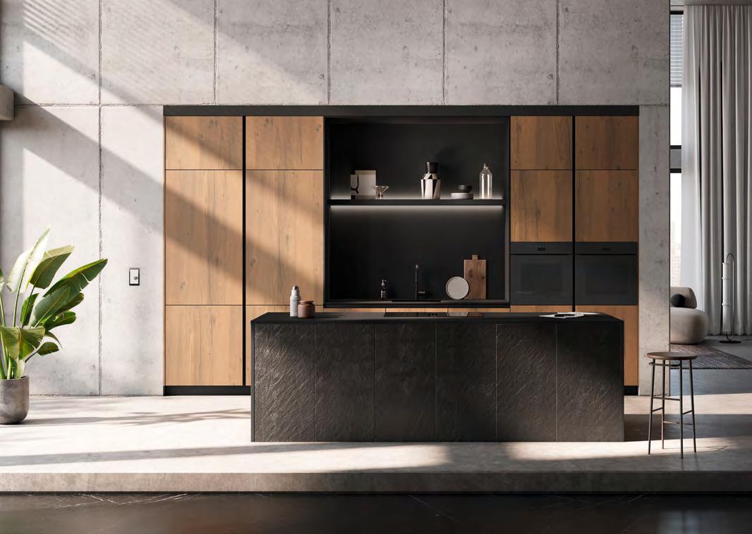 Hier rücken Materialgewicht und Präzision stärker in den Fokus. Lineare, handwerklich anmutende Holzoptiken werden mit klassischen Materialien wie Travertin und Marmor kombiniert. Wertigkeit entsteht nicht über dekorative Effekte, sondern über das Zusammenspiel von Oberfläche, Struktur und Proportion. Konkrete Dekor und Materialkombinationen wie U220 ST9 Softbeige, U250 ST9 Caramelbeige, F9581 ST20 Crossed Metal Bronze, F9071 PM Glamos Marmor grau oder H9799 ST12 Bookmatch Nussbaum zeigen einen zurückhaltenden Umgang mit Eleganz, der sowohl im Küchenumfeld als auch im architektonischen Innenausbau funktioniert.