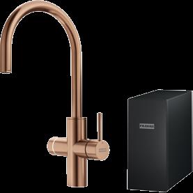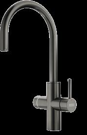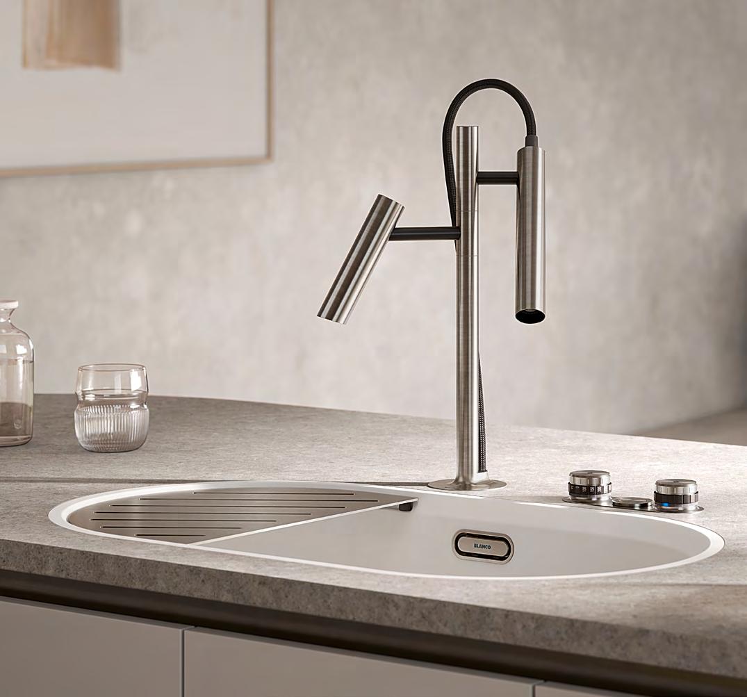 Die Armatur CHOICE LUNEOO-S und das Becken OOVALON bilden eine abgestimmte Blanco-Unit, die den Wasserplatz in der Küche gestalterisch in den Mittelpunkt rückt. Die schlanke, skulpturale Armatur mit textilummanteltem Schlauch und separatem Bedienrad bietet zwei Strahlarten und optional eine 6-in-1-Funktion von gefiltertem über gekühltes bis kochend heißes Wasser, hygienisch getrennt geführt.