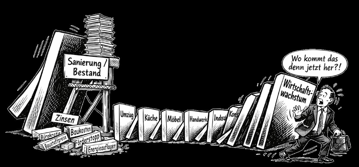 Der Wohnungsbau erscheint hier nicht als gewöhnlicher Wirtschaftszweig, sondern als Voraussetzung wirtschaftlicher Planungssicherheit für private Haushalte. Werden Bau und Finanzierung unsicher, verschieben Haushalte nicht nur Anschaffungen, sondern auch grundlegende Lebensentscheidungen, wie Umzüge oder Eigentumsbildung. Die schwache Nachfrage nach Möbeln ist damit mitunter weniger ein kurzfristiges Konsumphänomen als Ausdruck gesunkener Planungssicherheit.
