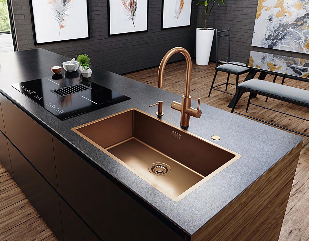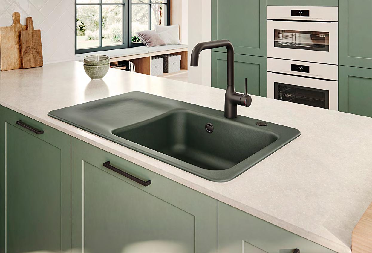 OOVALON überzeugt mit ovaler Geometrie, „KingSize-CapFlow“-Ablauf und dem samtig-robusten Material Velgranit. Die feine Randgestaltung erlaubt nahezu flächenbündigen oder Unterbau-Einbau, Farben und Metalloberflächen sind kombinierbar. Gemeinsam verwandeln Armatur und Becken den Küchenwasserplatz in eine ruhige, funktional durchdachte Designmitte der Küche.