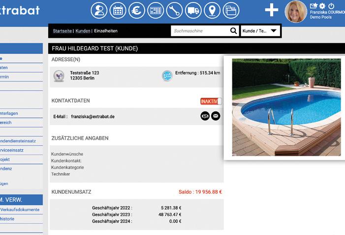 Peters: Wir bieten weiterhin die bewährte Extrabat-Pools-Software mit 15 Modulen und zwei Mobile-Apps an. Mit unserer All-in-oneSoftware können Poolbauer ihr gesamtes Unternehmen verwalten, vom Angebot über die Baustellenplanung bis hin zur Dokumentation vor Ort. Unsere stetig wachsende Artikeldatenbank enthält Produkte vieler wichtiger Hersteller. Smarte Features wie die automatische