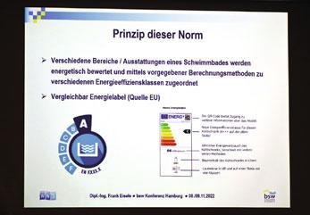 umständlicher Formulierungen in eine übersichtliche Struktur zu bringen und die Teilnehmer waren bis zur letzten Sekunde interessiert und aufmerksam. Eines ist gewiss: Die freiwillige Selbstverpflichtung der Branche zur Klassifizierung von privaten Schwimmbädern stößt auf großes Interesse. Schließlich ist dem Wirtschaftszweig Schwimmbad & Wellness das ressourcenschonende Schwimmver-