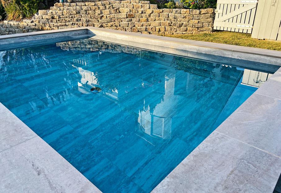 Ein Pool mit weißen Platten: Das Wasser erscheint hellblau. Bei Fliesen mit grau-weißer Struktur wird das Wasser blau-grün.