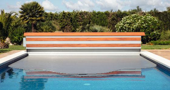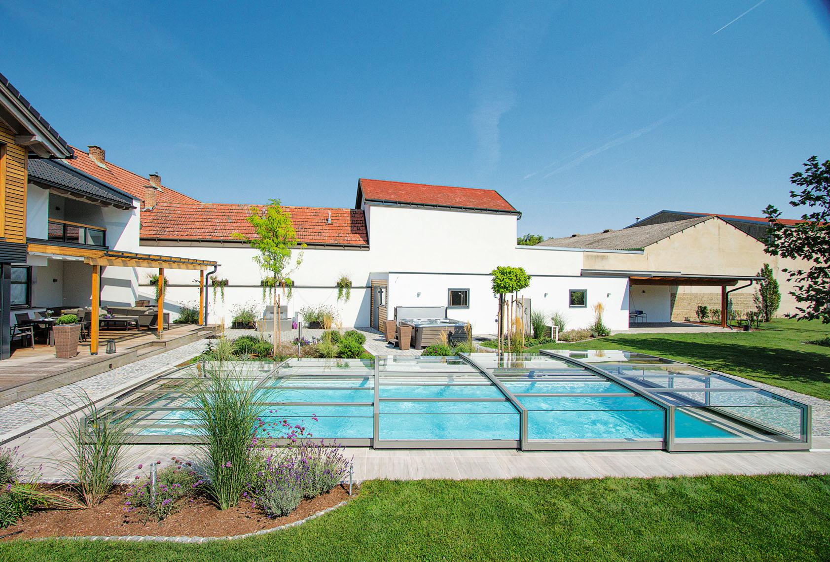 Der Pool mit eingefahrener Überdachung. Das aus Fasververbundkunststoff hergestellte Becken „Cayo 1000.msc“ von Leidenfrost ist zehn Meter lang; die großzügigen Maße bieten maximales Schwimmvergnügen. Der Technikschacht ist in der Beckenumrandung untergebracht.
